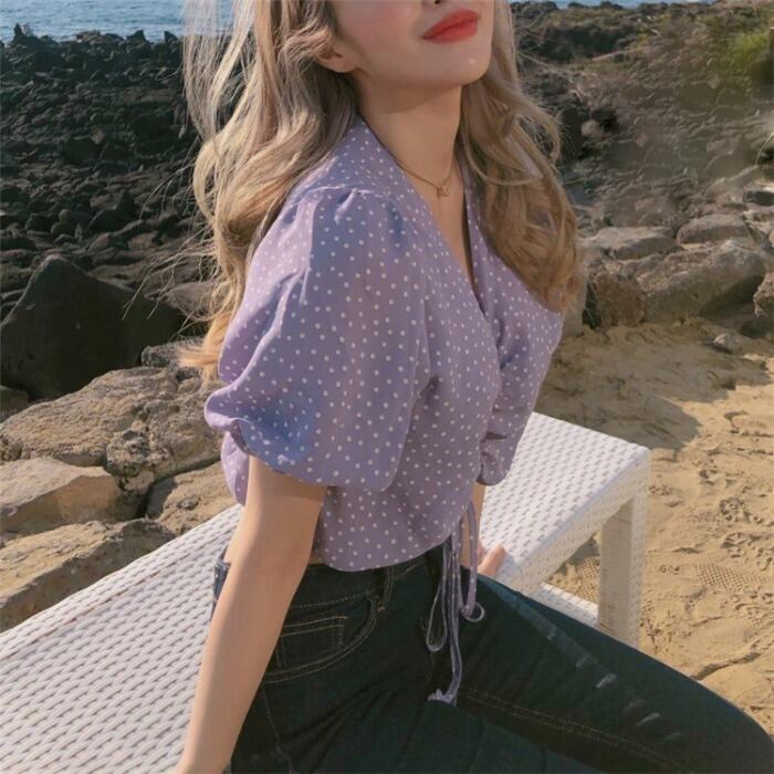 South Ins Vitality HyunaスタイルサマーワイルドドローストリングVネックシャツショートシャツかわいい水玉トップ 韓国婦人73035923894