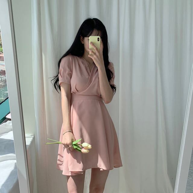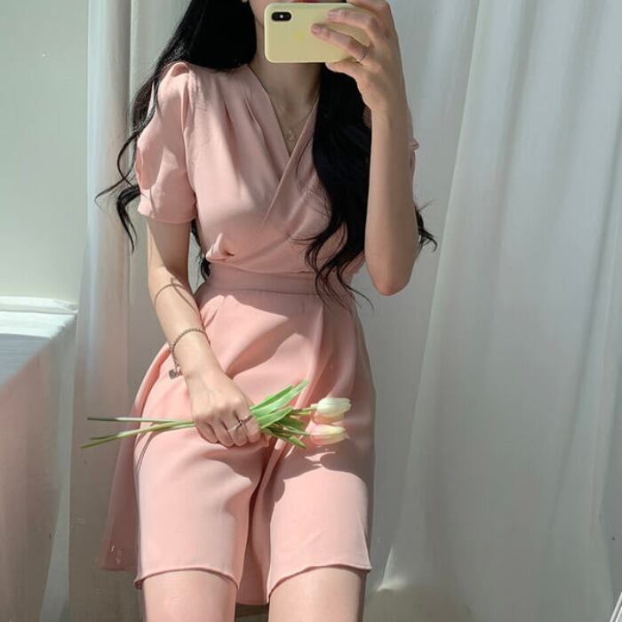 シックな夏フレンチスタイルウエスタンスタイルVネックソリッドカラーネクタイウエストシンショートシフォンドレス 韓国婦人24157953075