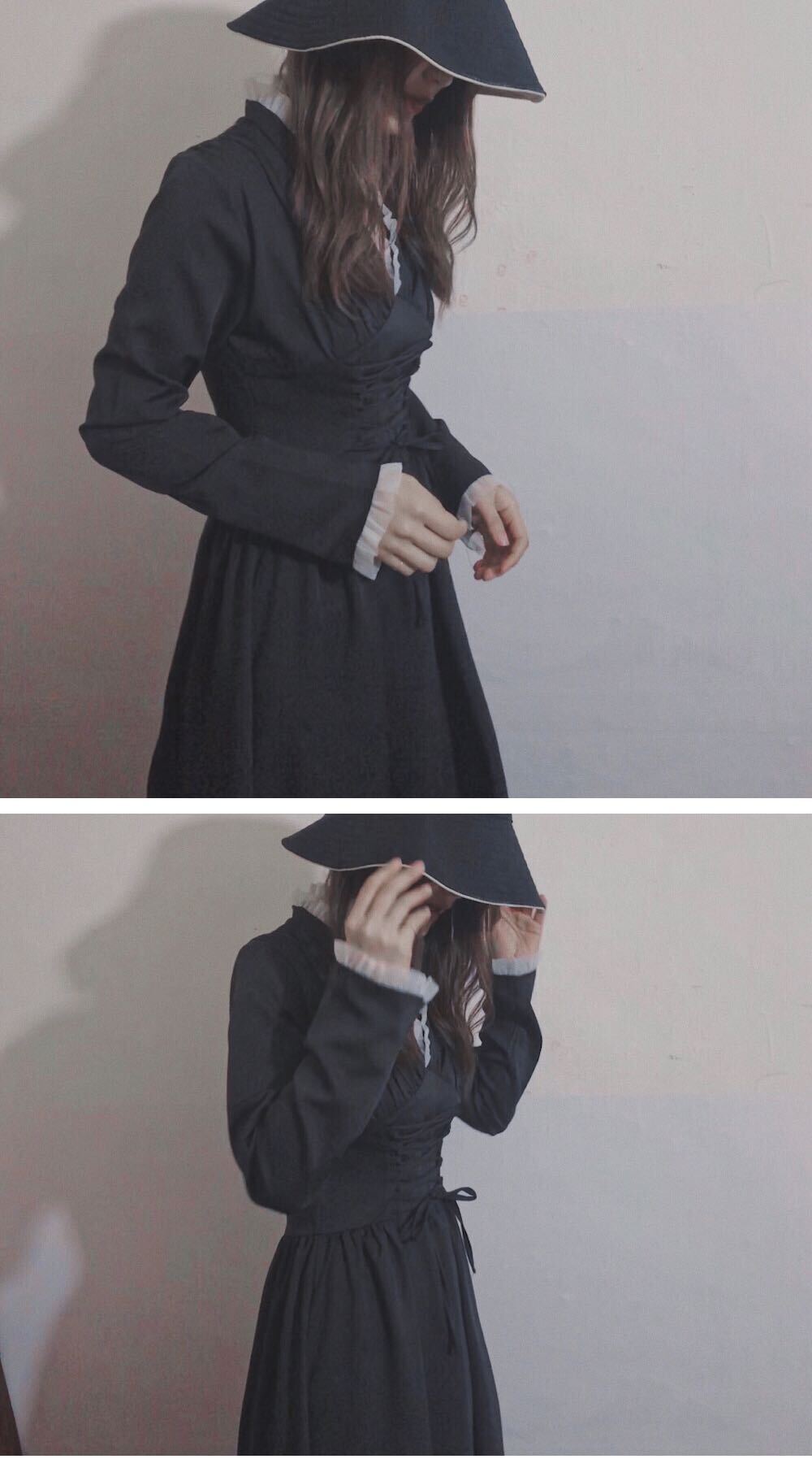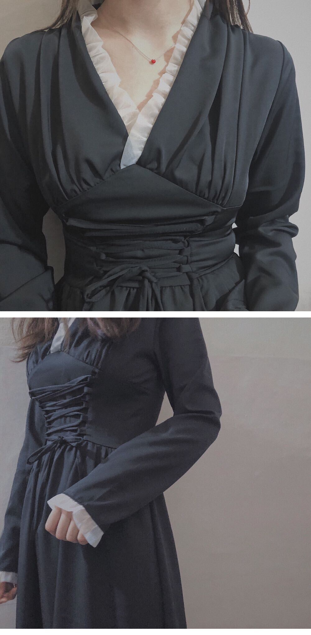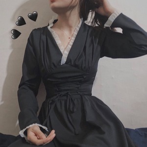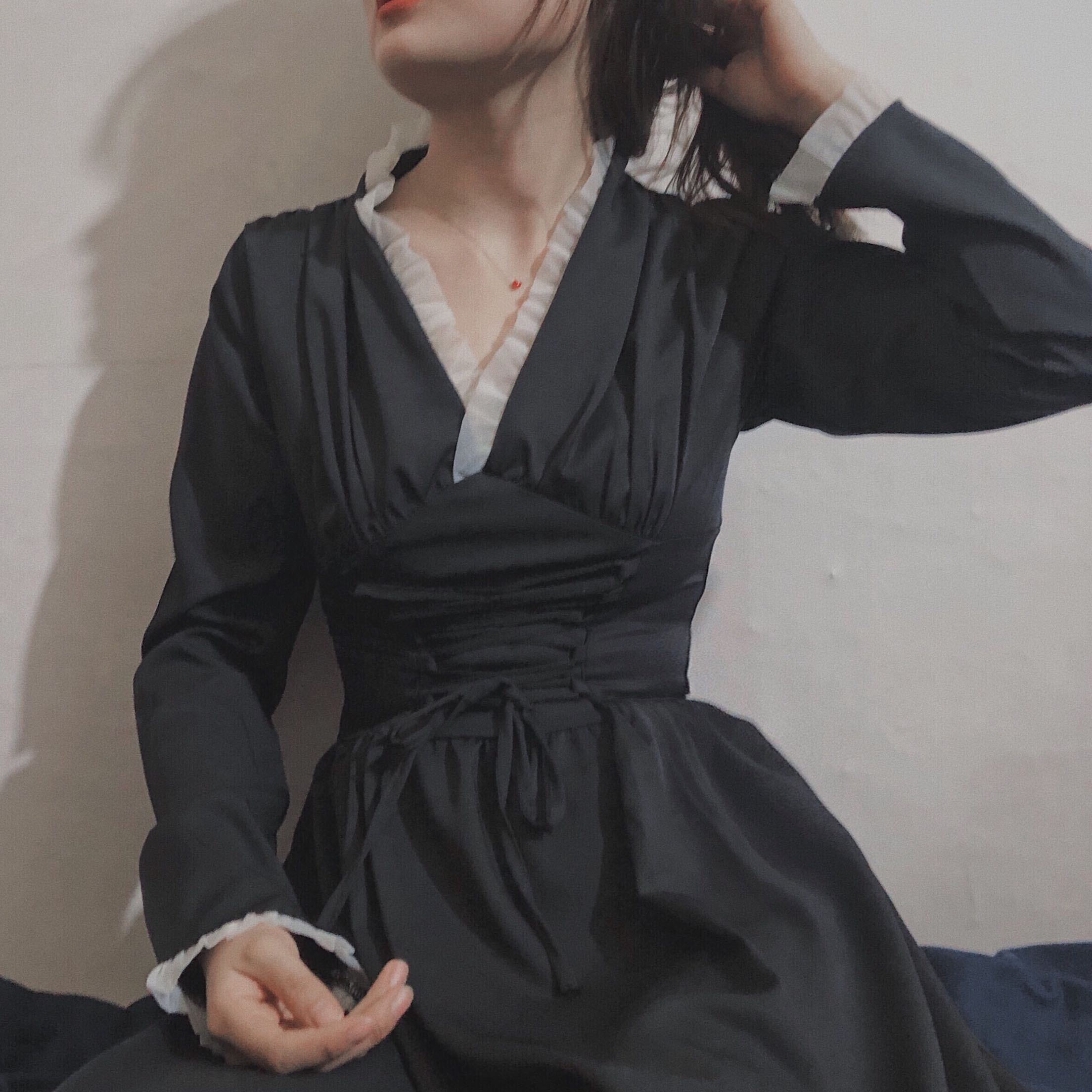 スプリングスタンダードVネックウェストロングドレス レトロ 春物 韓国婦人92609990836
