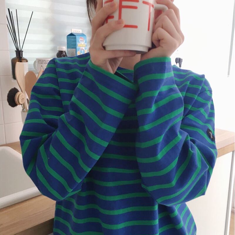 スプリングオータムスタンダードシャツ ルーズストライプTシャツ レディース ロング レトロ 春物 秋物 韓国婦人84638594798