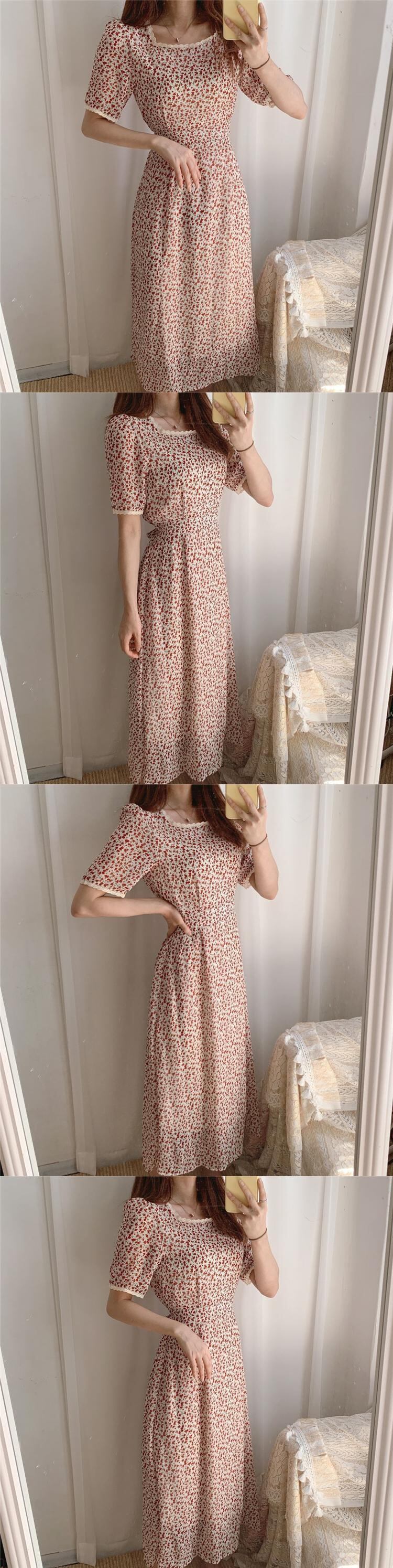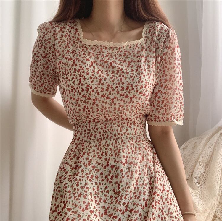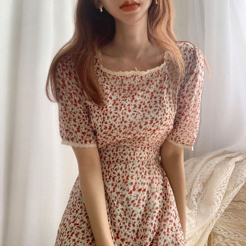 サマーフローラルロングスカート カラーレース半袖スリーブドレス ショート ハーフスリーブ 大人ガーリー スウィート キュート カジュアル 夏物 花柄 スクウェア ステッチ 韓国婦人40810877449