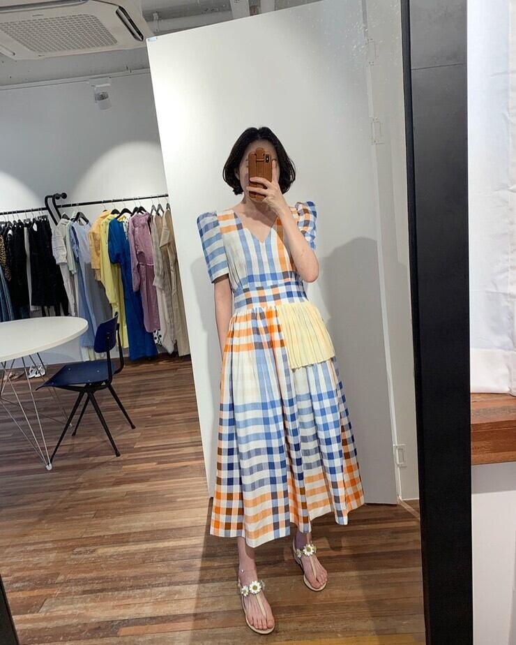 シックなレトロなウエスタンスタイルのVネックカラーマッチング、肌に露出したチェック柄、ハイウエスト、薄い、パフスリーブドレス、ロングスカート 韓国婦人49475104536