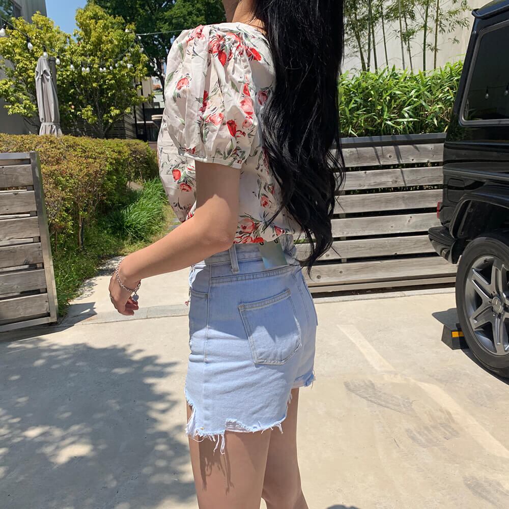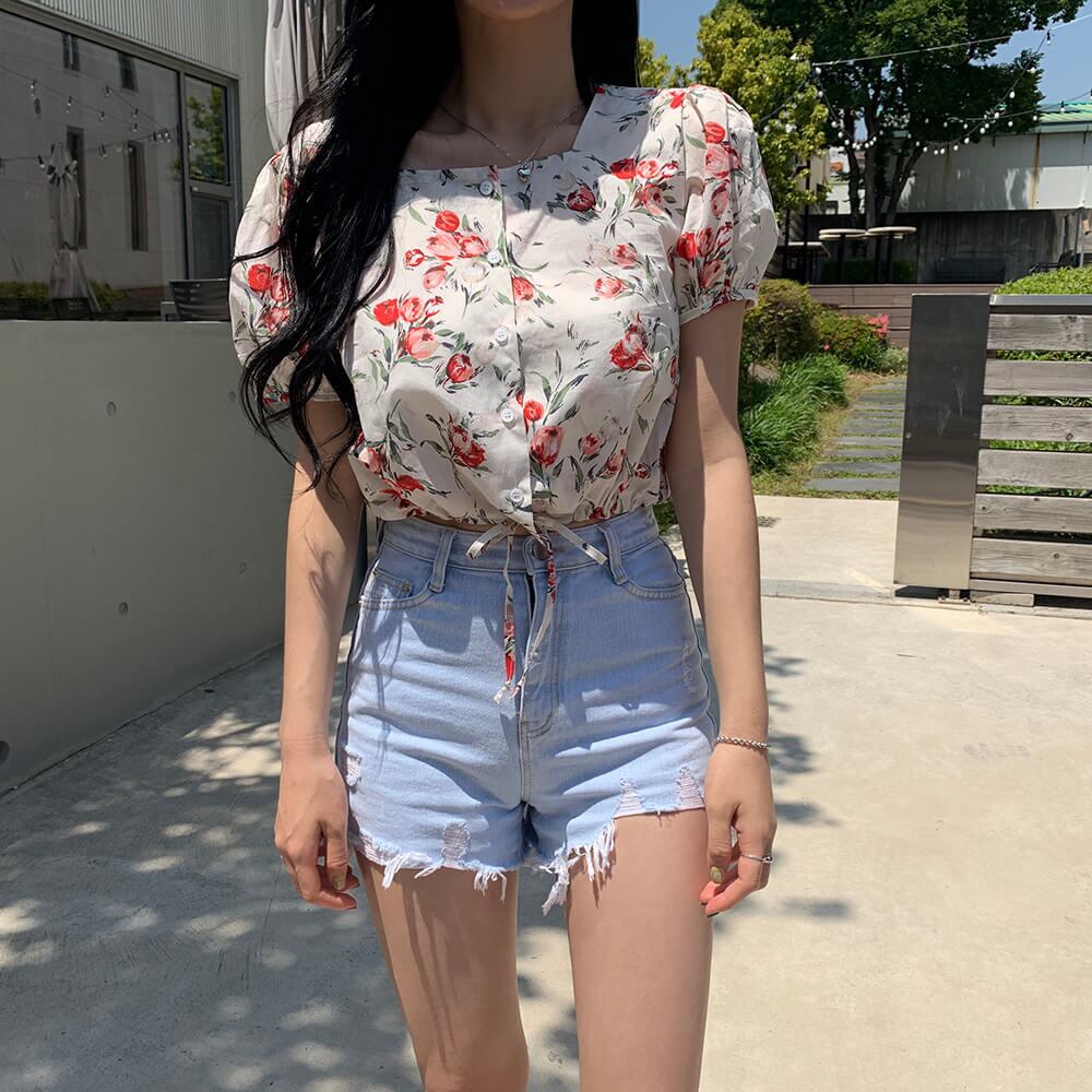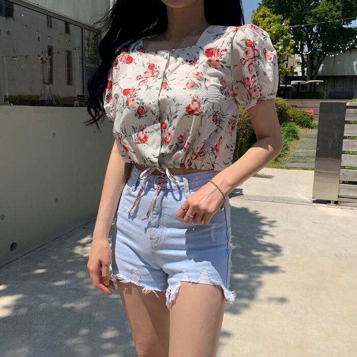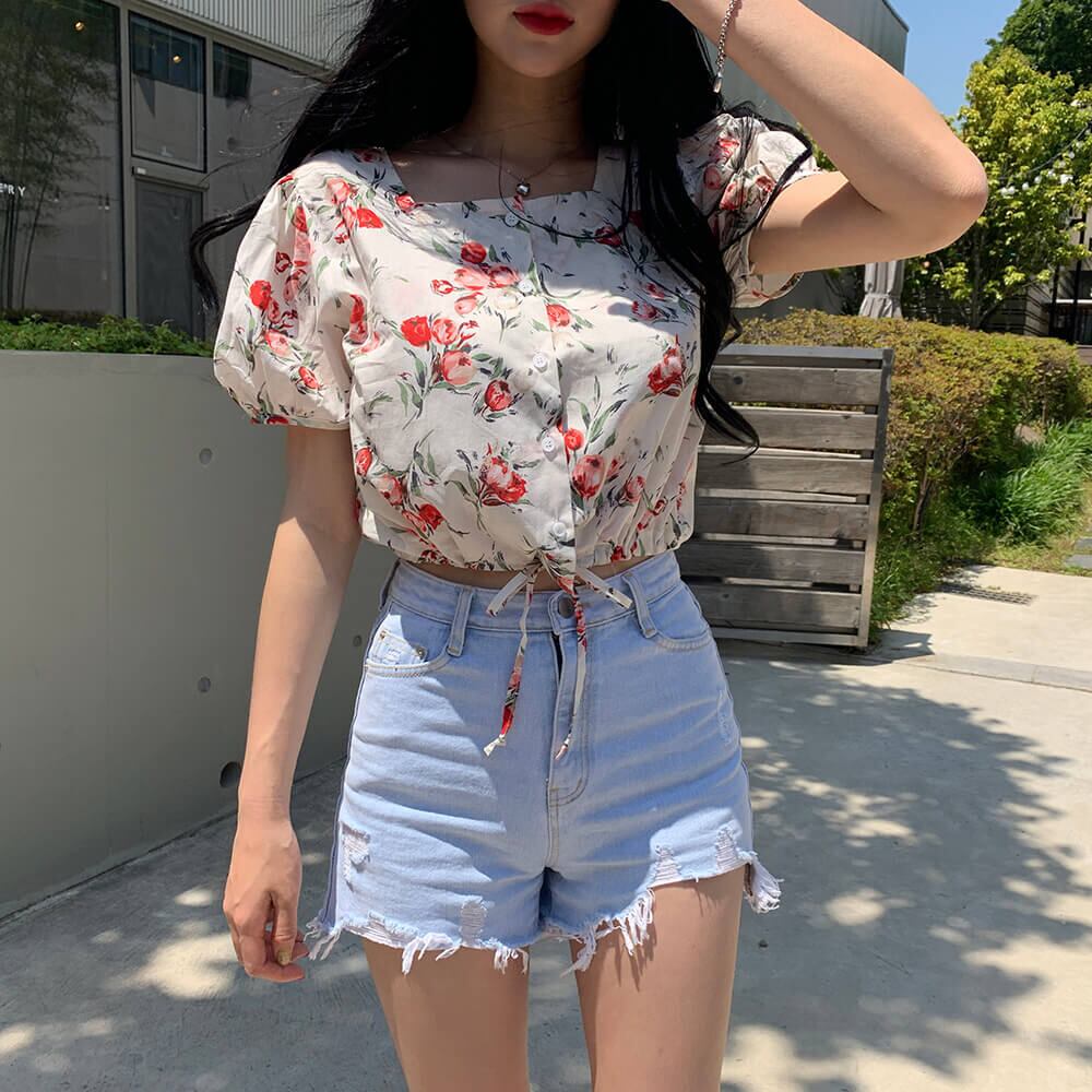 シックな甘い野生の小さな花の正方形の襟シングルブレスト裾巾着ネクタイパフスリーブショートシャツ女性 韓国婦人78639418082