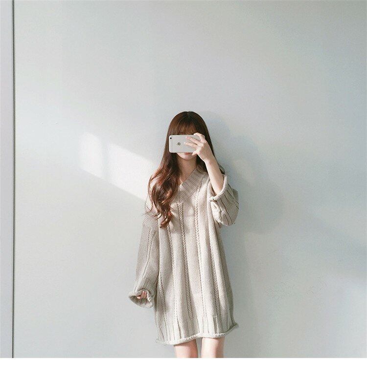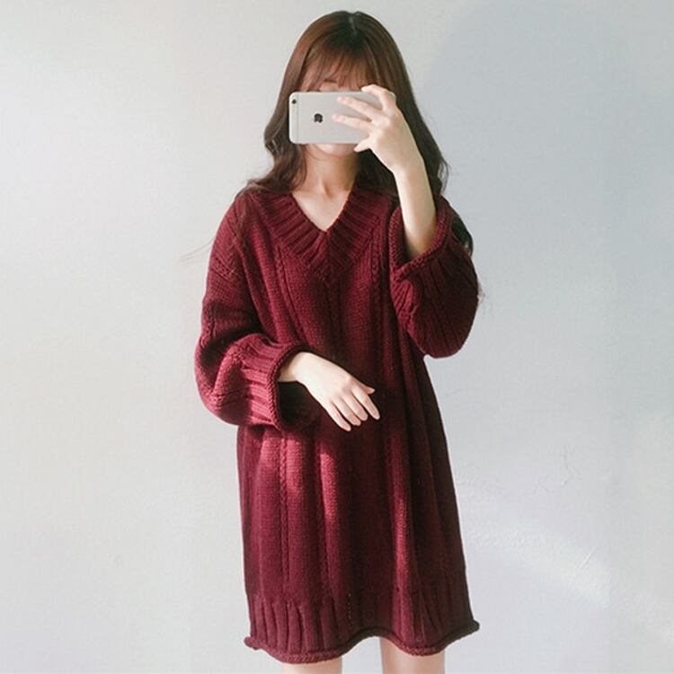 スタイルソリッド カラールーズ薄手Vネックプルオーバー 長袖スリーブセーター レディースジャケット ロング ソリッドカラー 韓国婦人15217961387