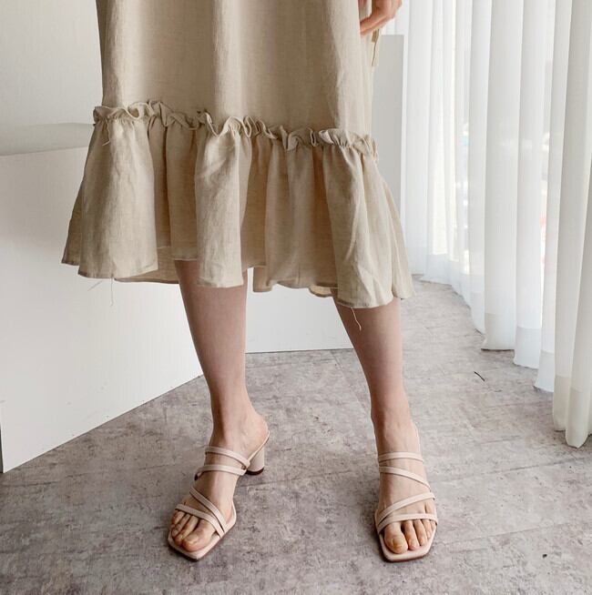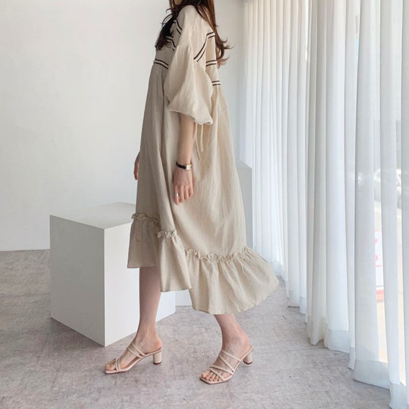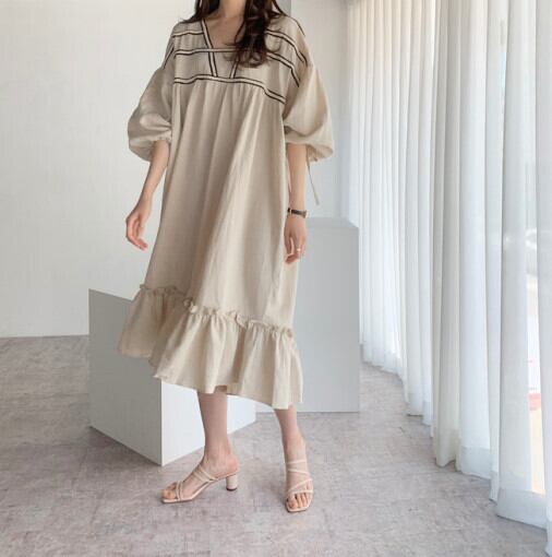 2020年夏の新作綿とリネンのドレスフレンチレトロコントラストカラー巾着リボンパフスリーブスカート 韓国婦人59501361274