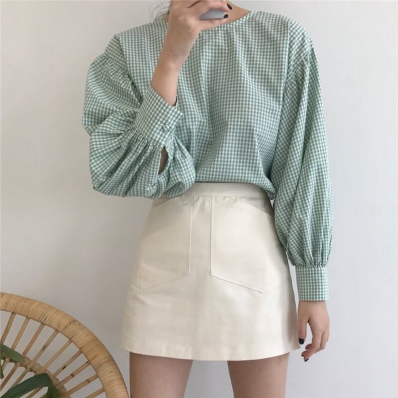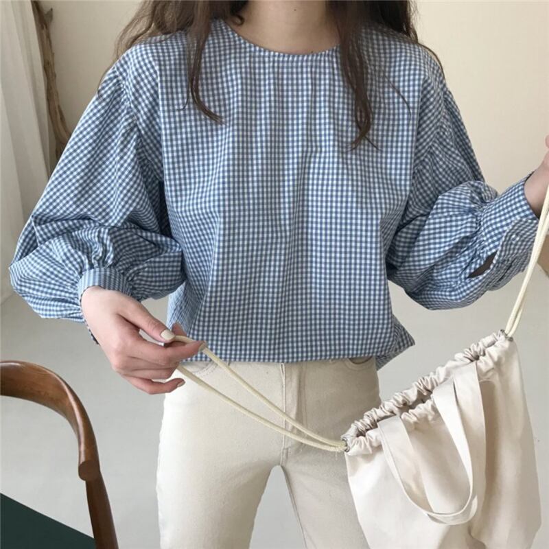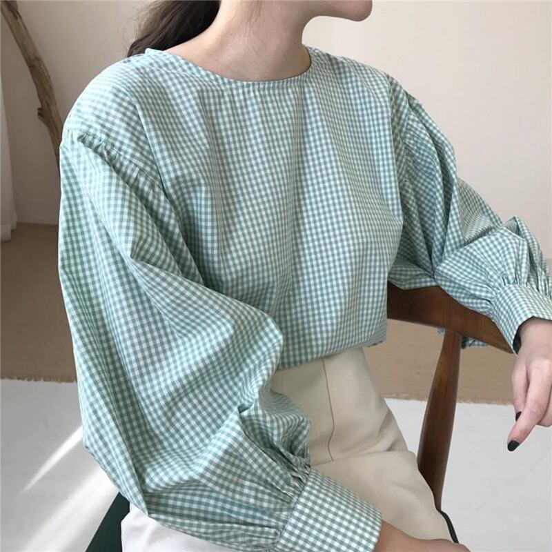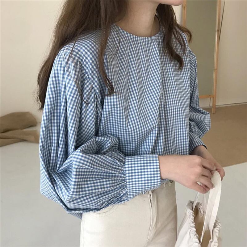 サマースタイル格子柄スリーブ長袖 ロング ランタンスリーブ ブラウス 大人ガーリー スウィート キュート カジュアル 夏物 韓国婦人16612526380