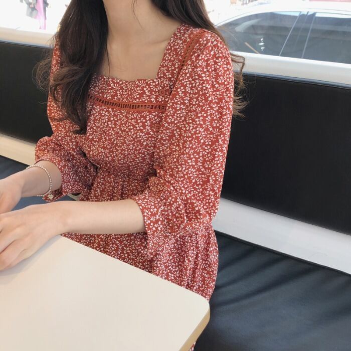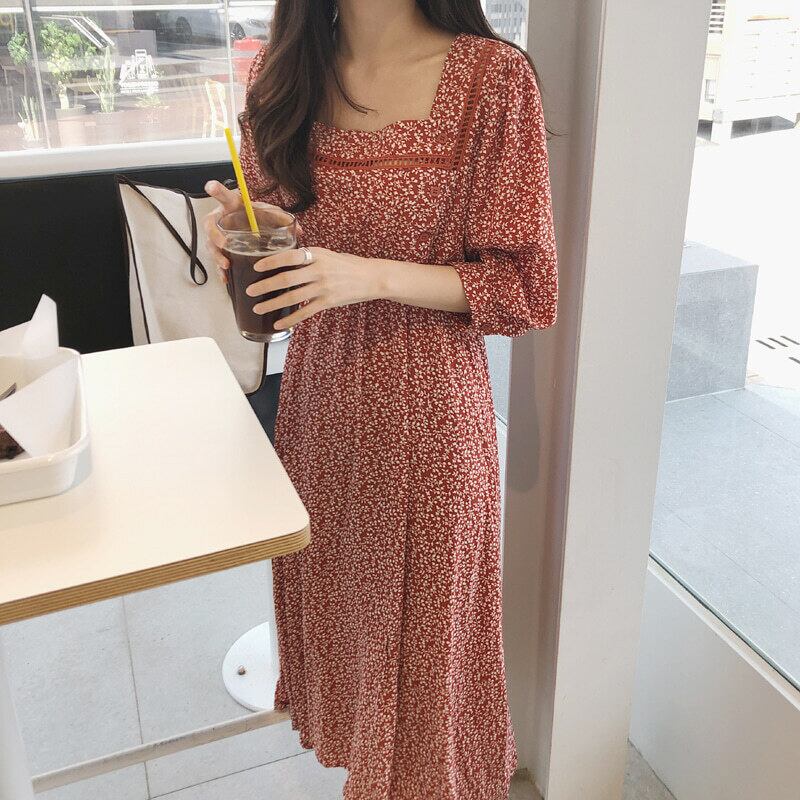 夏の新しいシックなレトロな甘い花の弾性ウエストドレス女性ins小さな正方形の襟中空ロングスカート 韓国婦人39818820862
