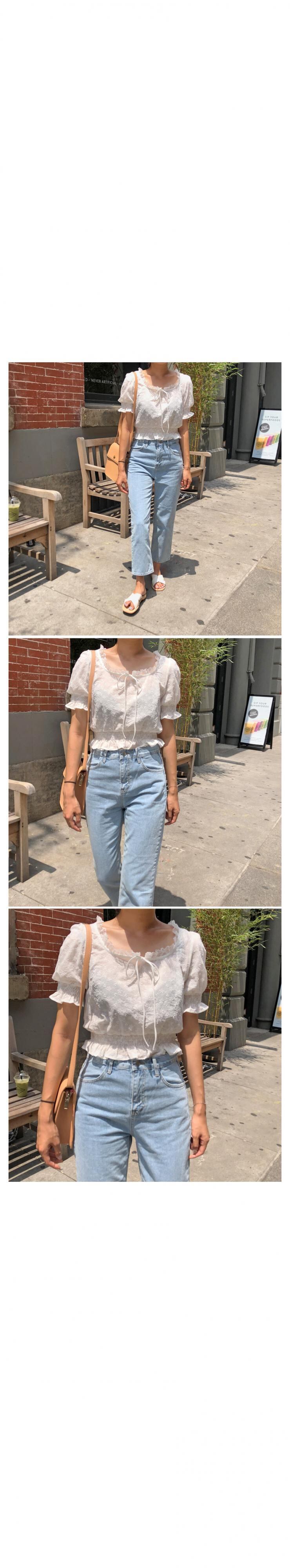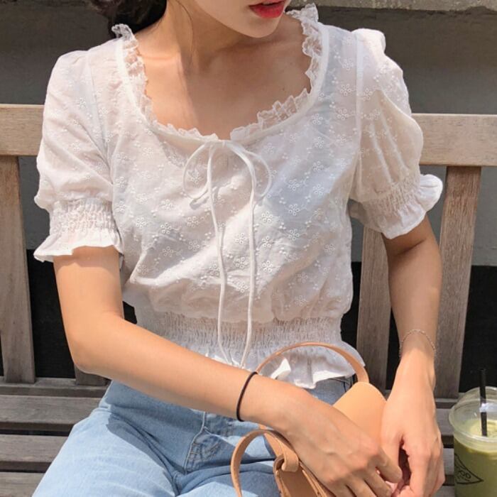 2020夏新作スタイルシック重工業刺繍レーススクエアカラー無地ショートスリムトップTシャツ婦人服 韓国婦人42929970426