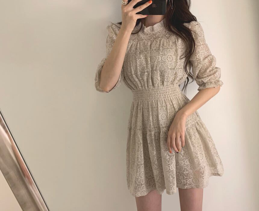 スタンダードスタイルレースウェストドレス レトロ 大人ガーリー スウィート キュート カジュアル エレガント 韓国婦人5763858249
