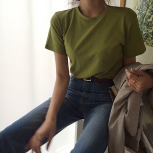 スタンダードホワイトソリッド カラーグリーン薄手スリムショート半袖スリーブTシャツ レディース レトロ ハーフスリーブ ソリッドカラー 韓国婦人40420111262