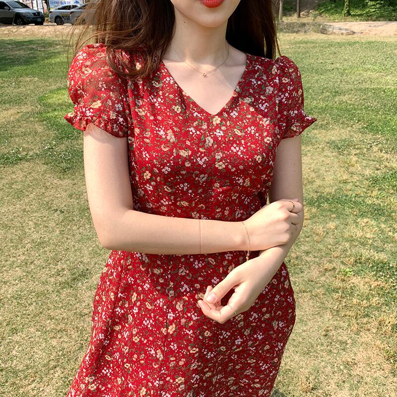 シックで優しい気質の小さな花柄のVネックハイウエストネクタイエレガントなパフスリーブシフォンドレスロングスカートの女性 韓国婦人55621246682
