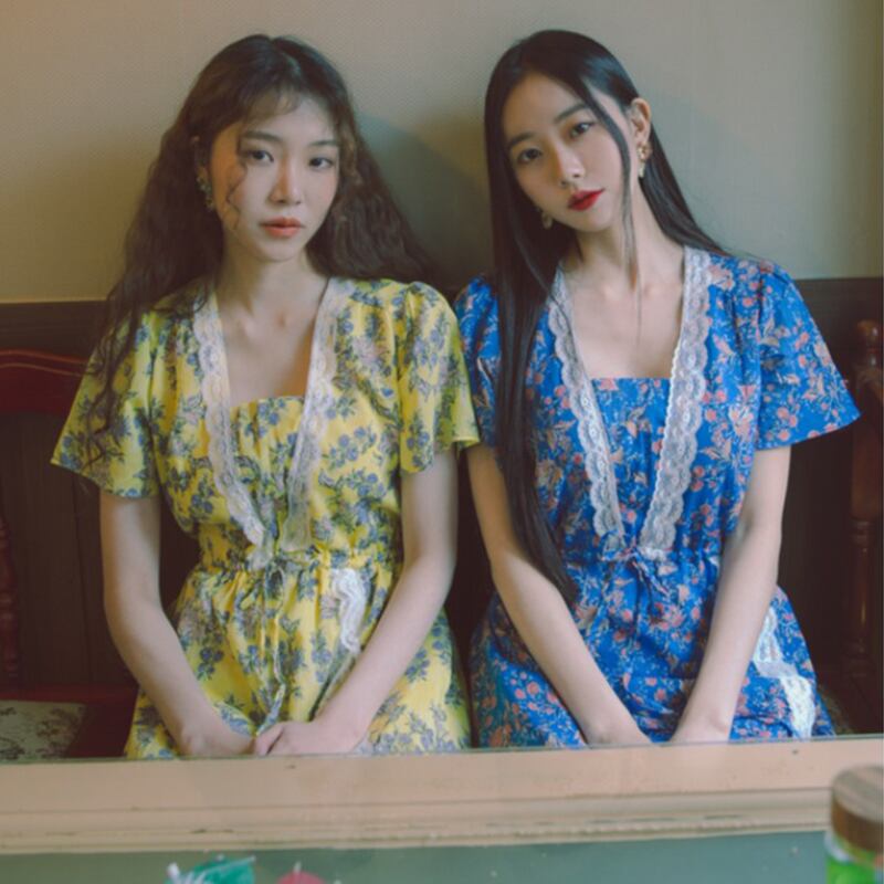 夏のシックなフレンズドレス年齢削減フローラルスクエアカラーレースウエストミドル丈フリルドレス 韓国婦人13244358379
