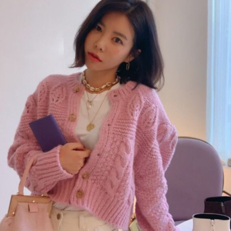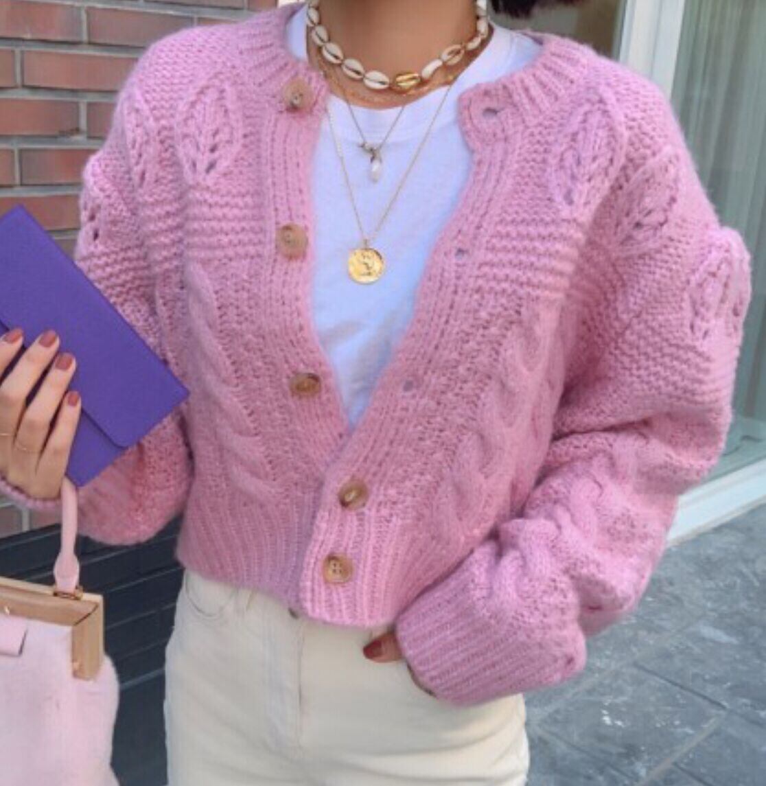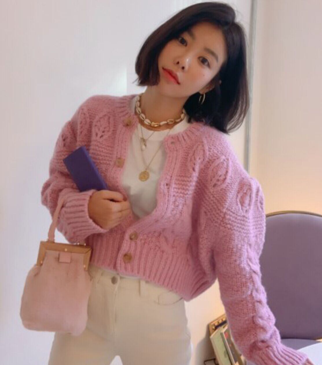 秋の新しいスタイルのレトロなピンクのパフスリーブショートツイストカーディガン長袖ニットセータージャケットの女性 韓国婦人3656261090