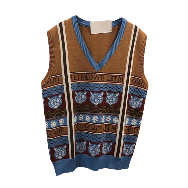 レトロVネックセーター女性のプルオーバーベスト緩い漫画猫手紙ステッチ色ノースリーブセーターベスト 韓国婦人41265947556