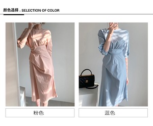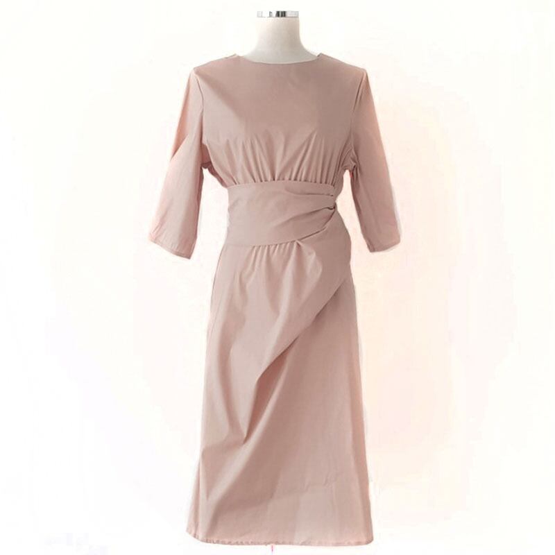 シックなフレンチレトロラウンドネックプリーツデザインスリムスリムウエストミドル丈パフスリーブドレスレディース 韓国婦人29374558534