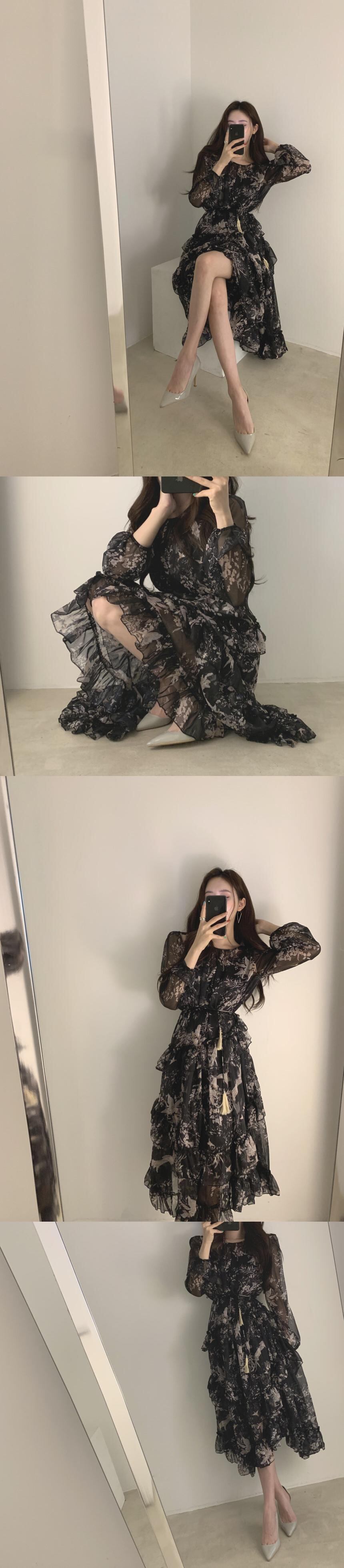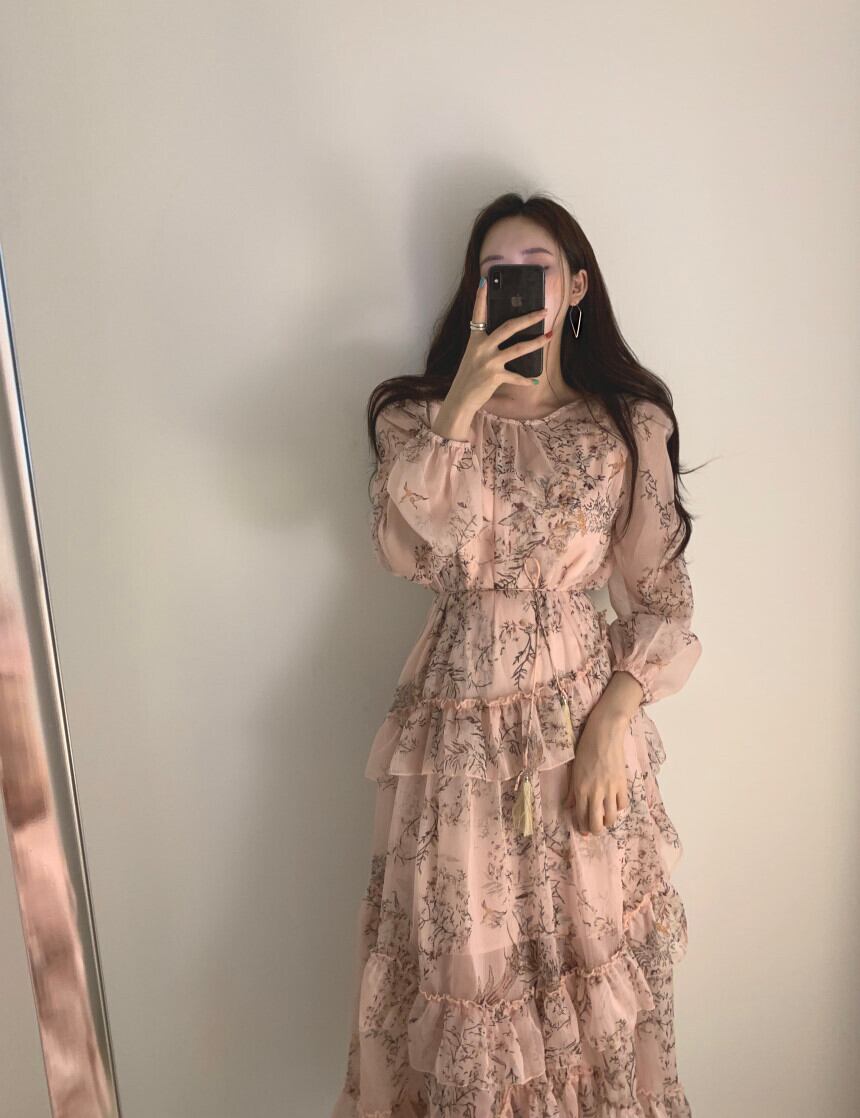 シックでエレガントな気質の色ラウンドネック重工業フリルハイウエストスリムでエレガントなミドル丈ドレスの女性 韓国婦人87622869867