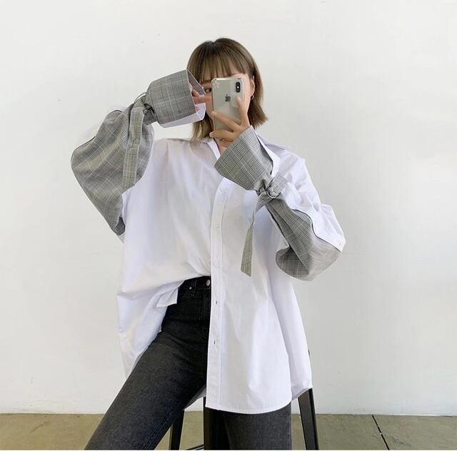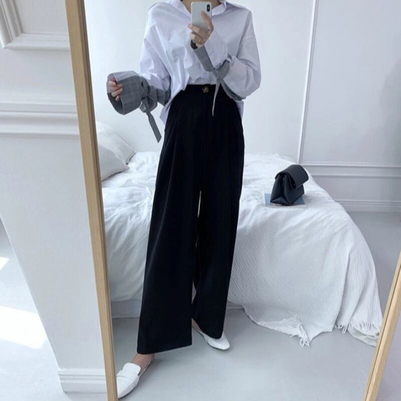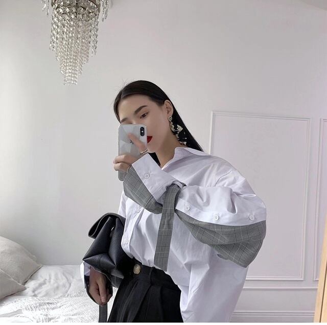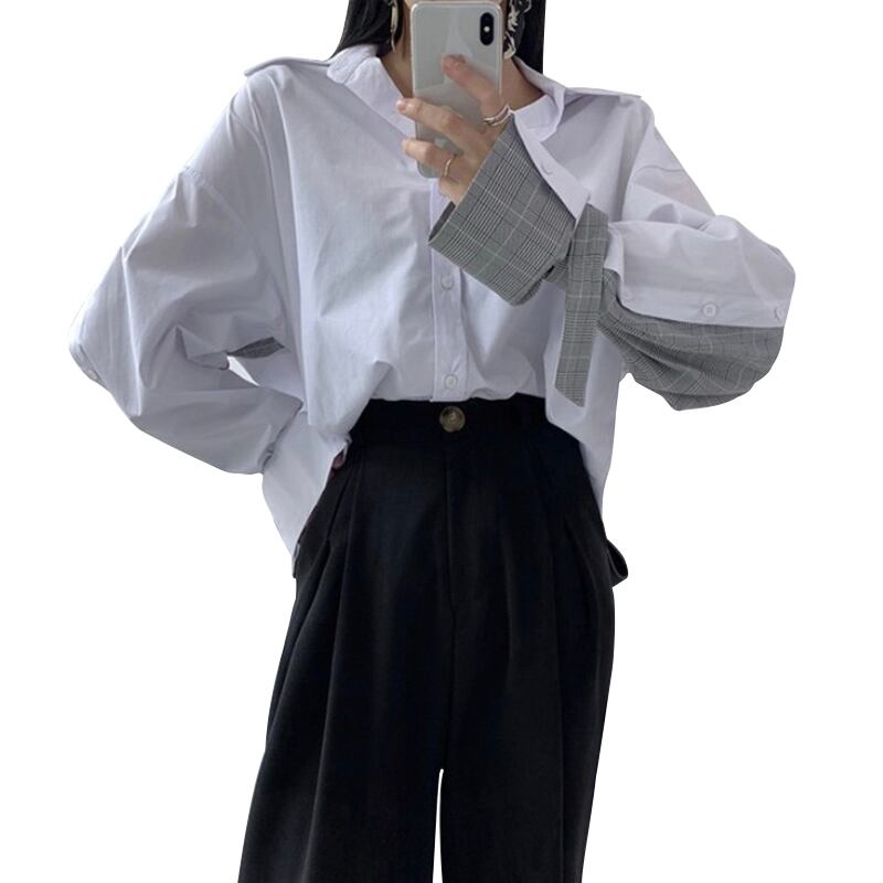 シックなレトロなソリッドカラーの格子縞のステッチ緩い野生の長袖シャツ+緩い脚の長いパパパンツ 韓国婦人44751210923