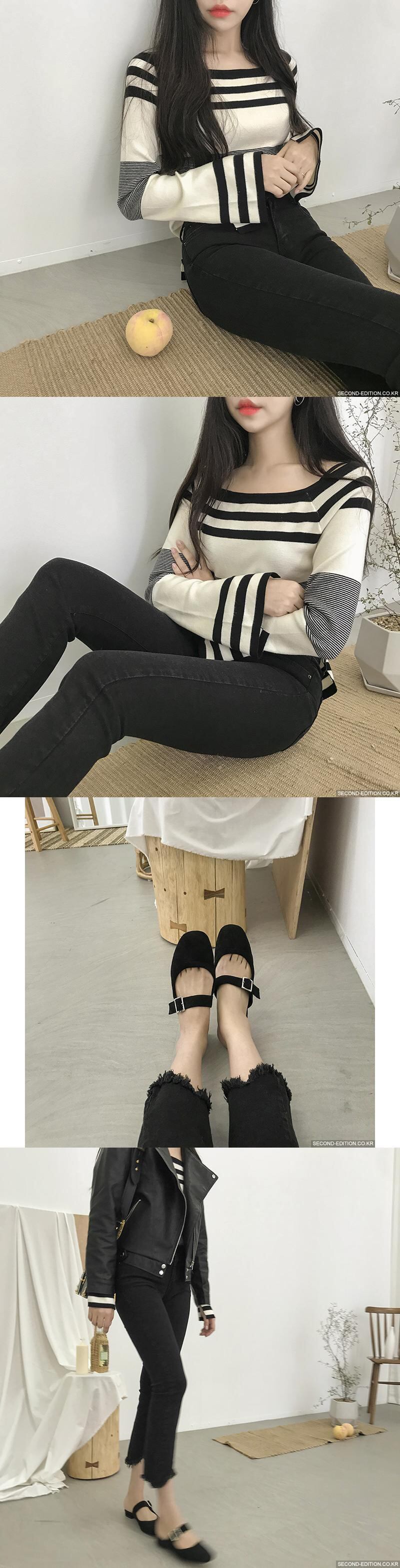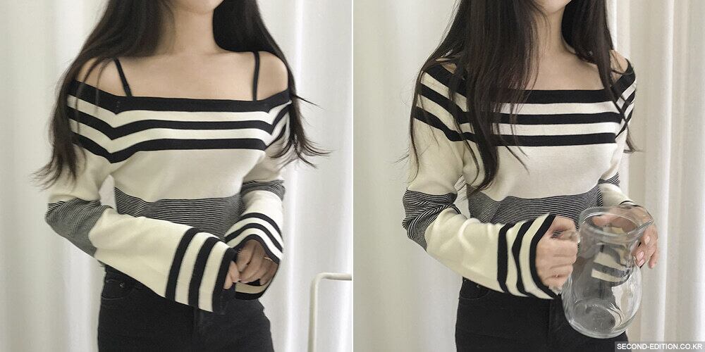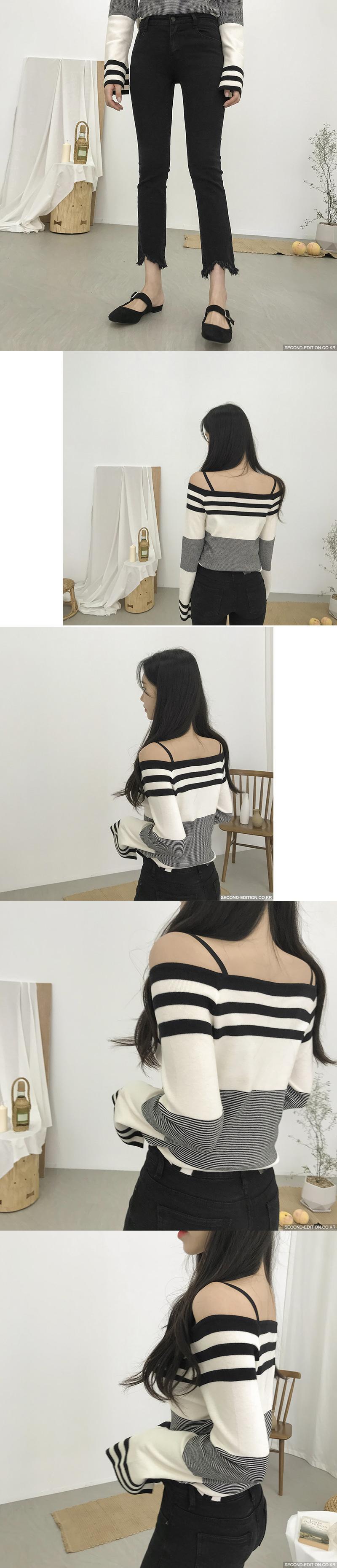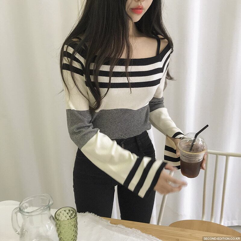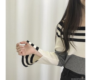 2020年春夏新作トップスレディースワンワードネックコアスパン糸ストライプ長袖ボトムスニットセーターカラーマッチングセーター 韓国婦人48203920442