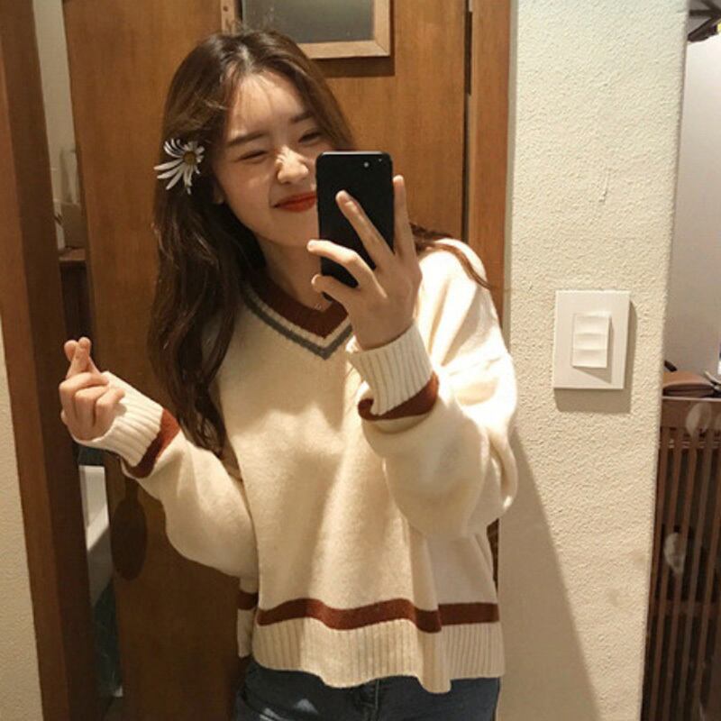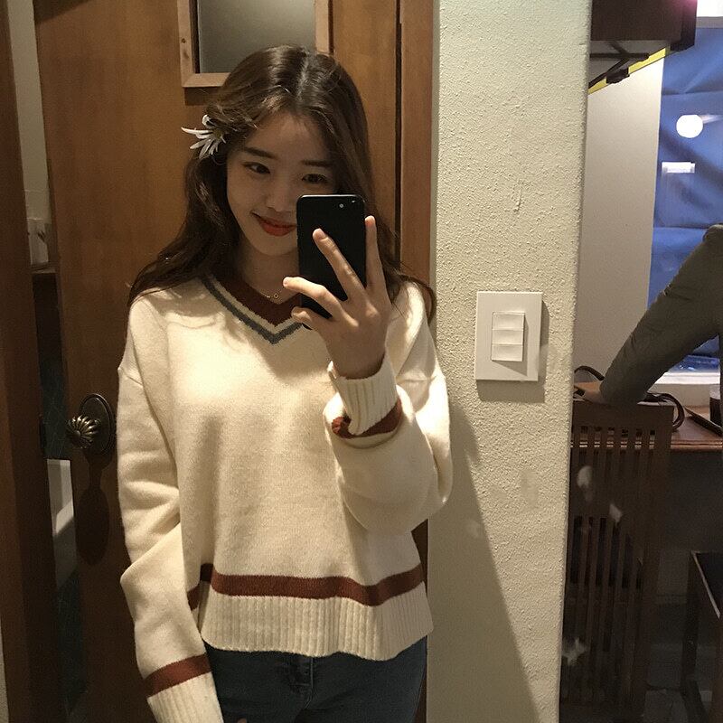 甘いvネックプルオーバーレディース2020秋と冬の新しい緩いコントラストカラーカレッジスタイルシンプルニットトップ 韓国婦人24816699229