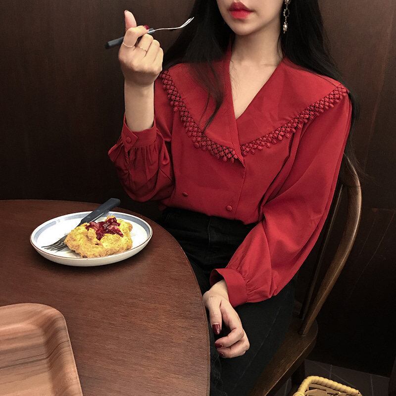 2020秋のシックなフリンジ付き蓮の葉のVネックシャツ、鎖骨のカーディオマティックデザインフレンチレトロトップ 韓国婦人29326816638