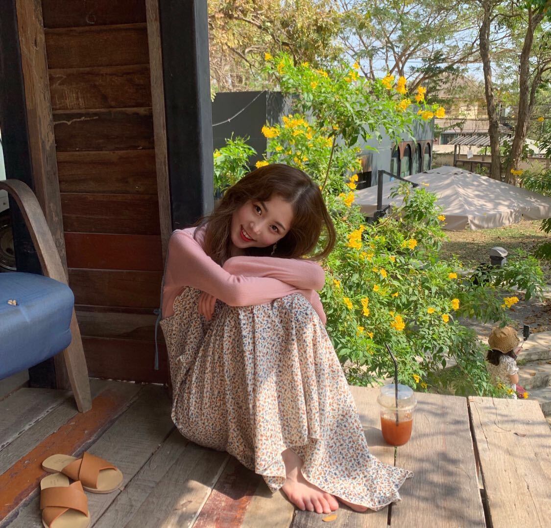 シックなスウィートピンクと柔らかな無地のロングスリーブボトムTシャツ+キュートなウッドイヤーのフローラルスリングドレス 韓国婦人56917067499