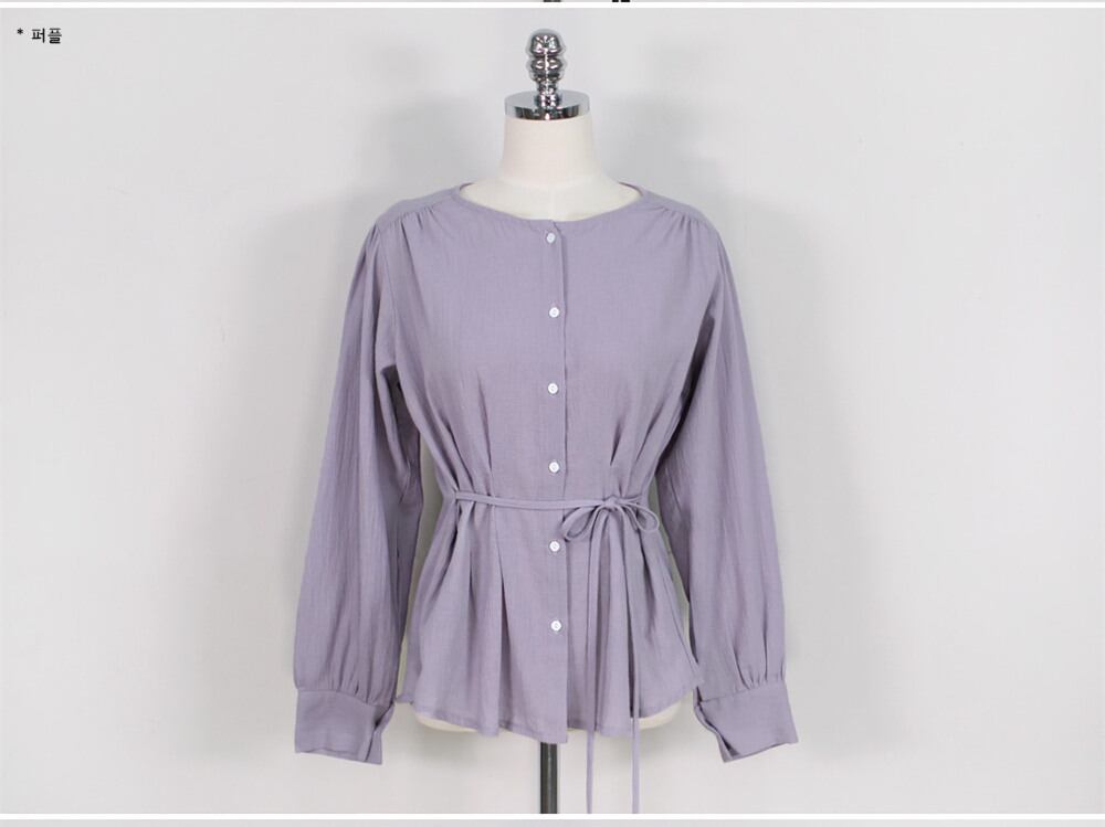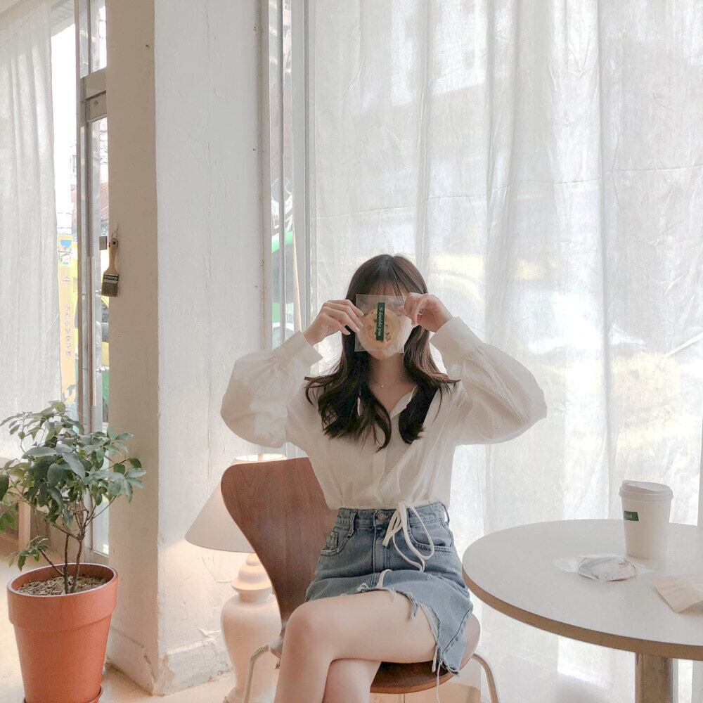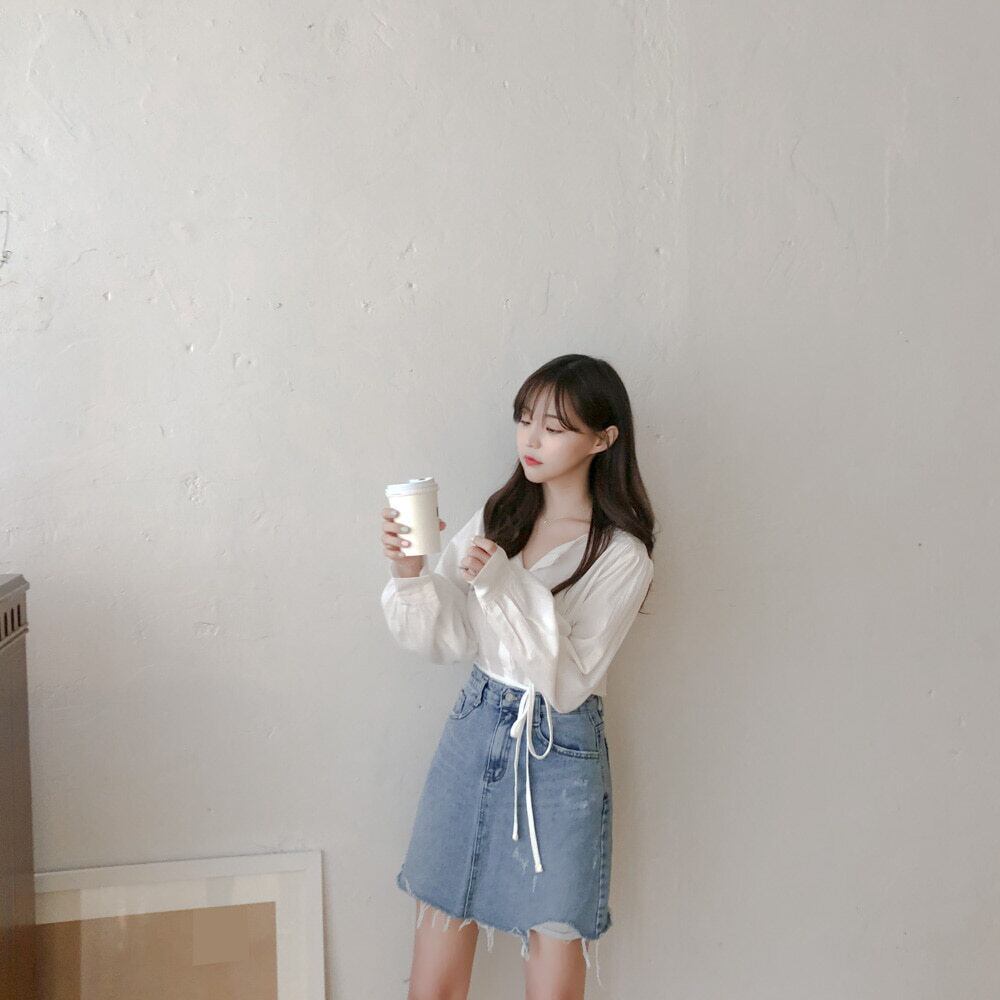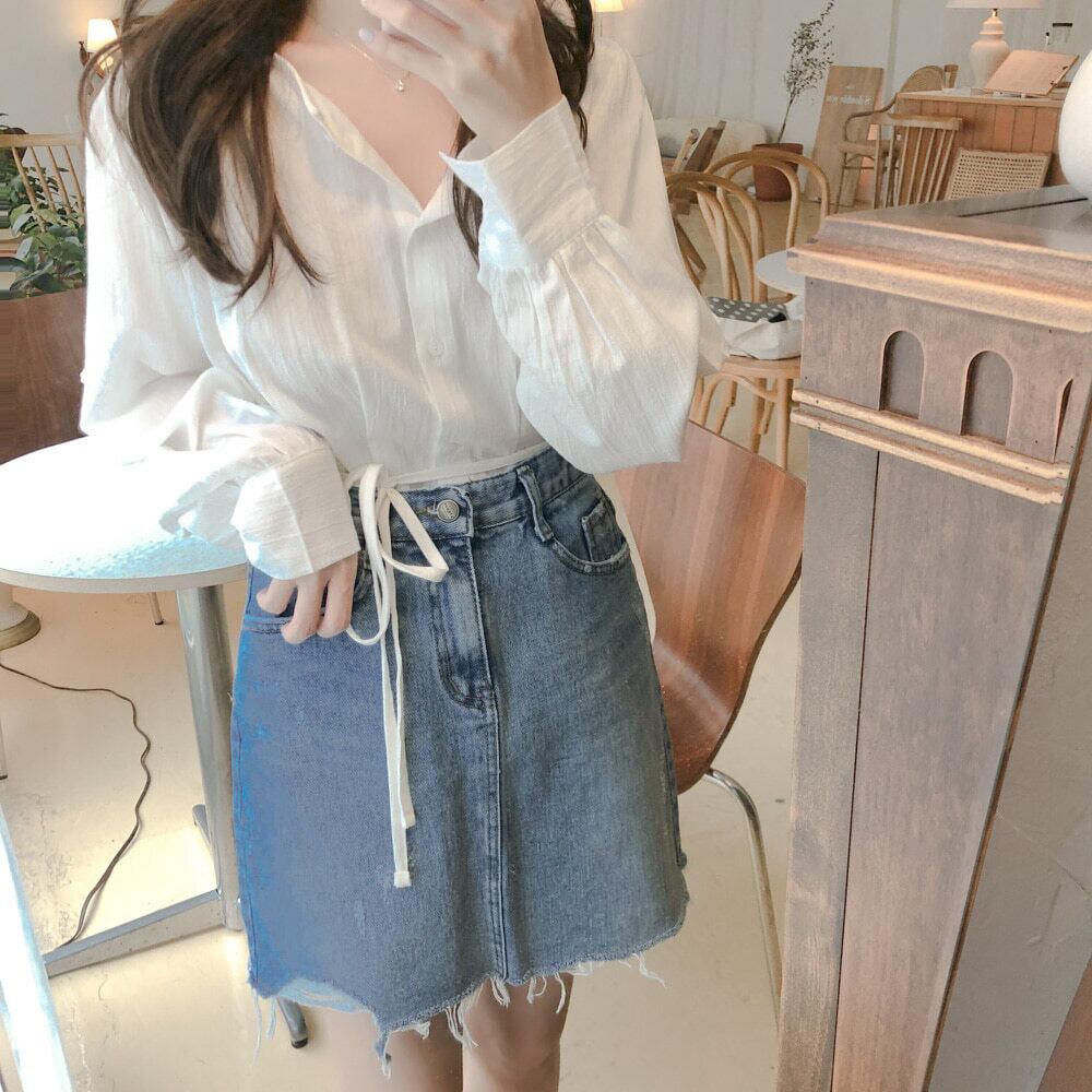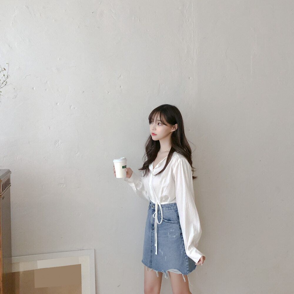 Vネック春ブラウスレディースデザインニッチ長袖フリル裾フリルウエストが細くて無地のシャツ 韓国婦人10174317630