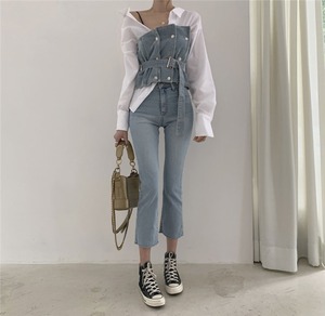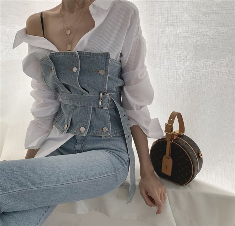 セクシーなパーソナリティダブルカラーストライプシャツ+アウターウェアチューブトップスタイル、ベルトデニムベストラップチェストツーピーススーツ 韓国婦人48644034630