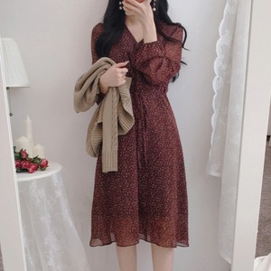 ニッチデザインフローラルシフォン長袖ドレス(ウエストと薄手の白いVネックプリントフェアリースカート) 韓国婦人72140221299