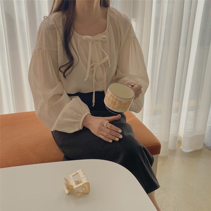 シックな春と夏の甘い年齢を減らすシャツの蝶ネクタイレトロな香港フレーバー学生バブル長袖シャツ女性 韓国婦人2411617843