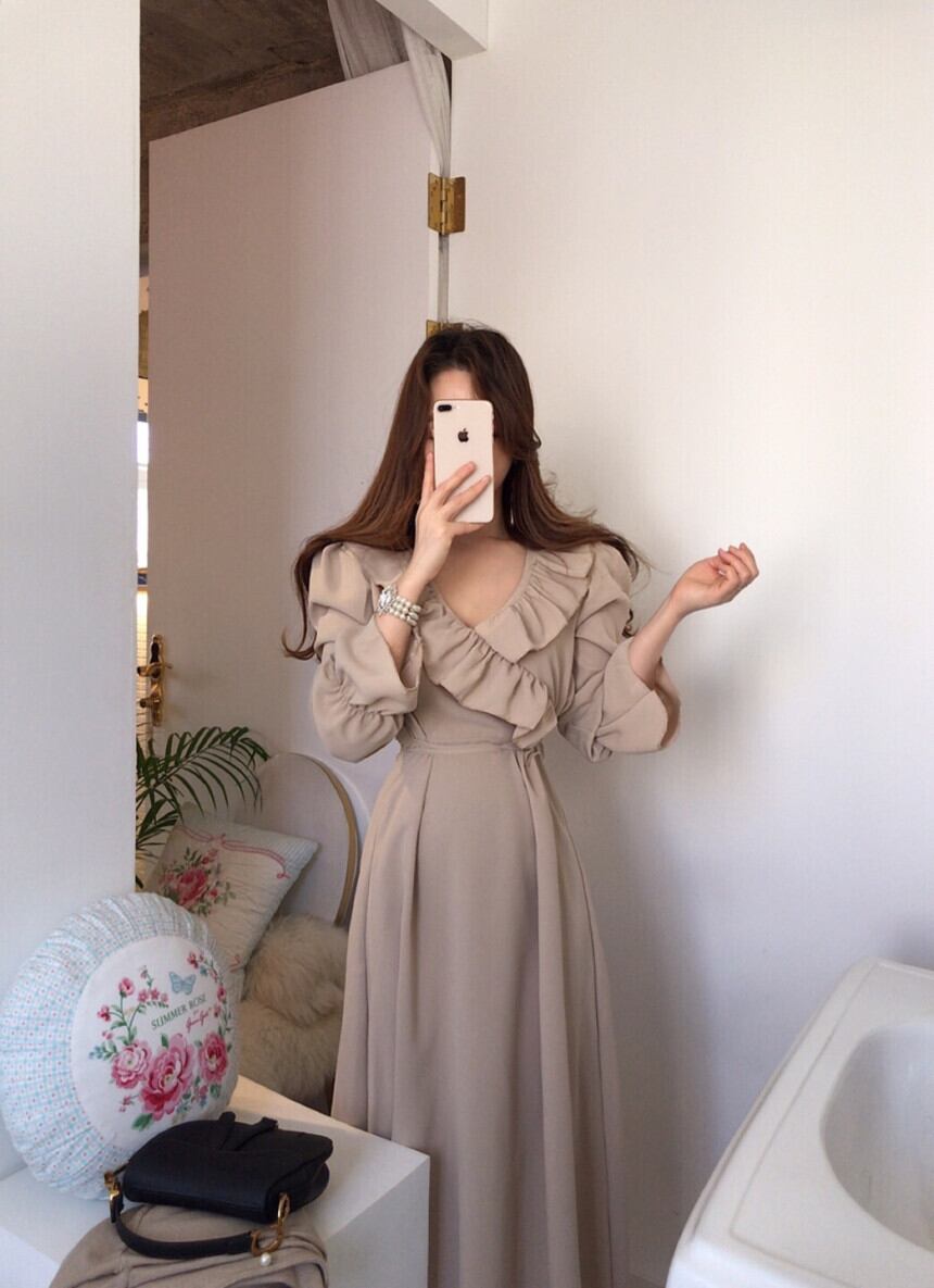 シックなフレンチ優しい間伐Vネックフリルベルトウエスト無地フレアスリーブワンピースロングスカートメス 韓国婦人63131825408