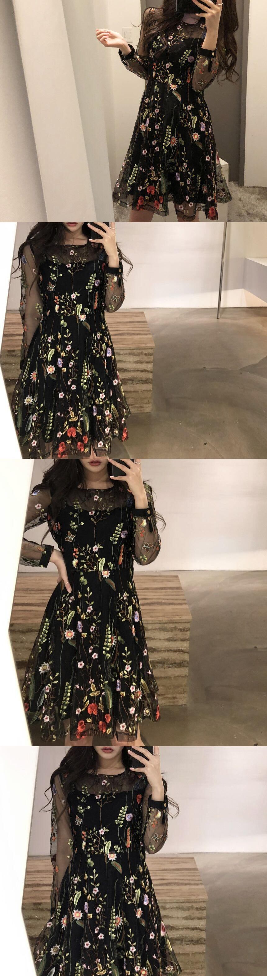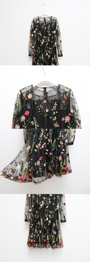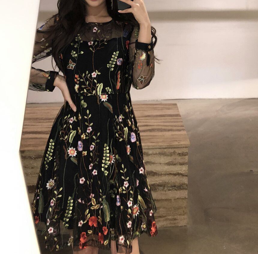 シックなレトロフェミニンな重工業刺繍小花チュールハイウエスト細いAラインドレススカート 韓国婦人37164007070