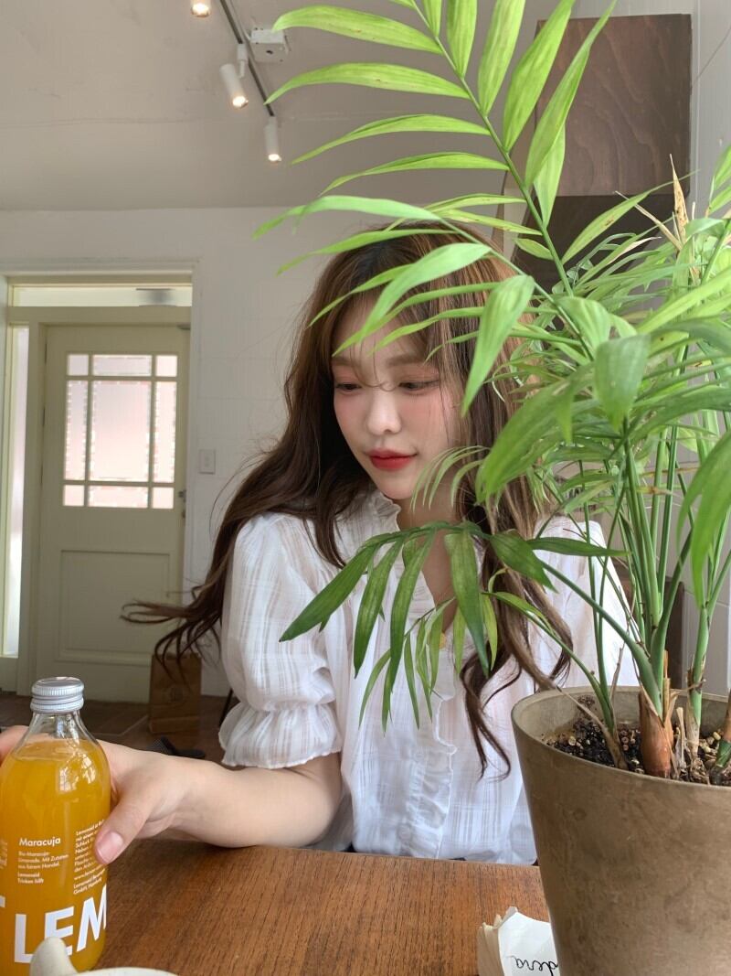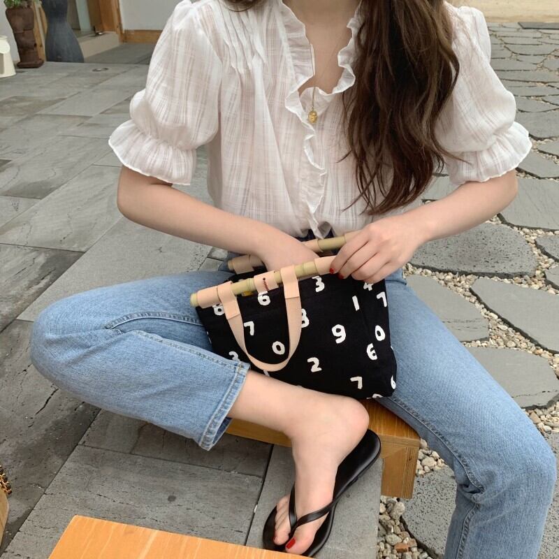 シックで小さくてフレッシュで甘いVネックの木製の耳中空シングルブレストルーズシンパフスリーブシャツシャツ 韓国婦人83484213525