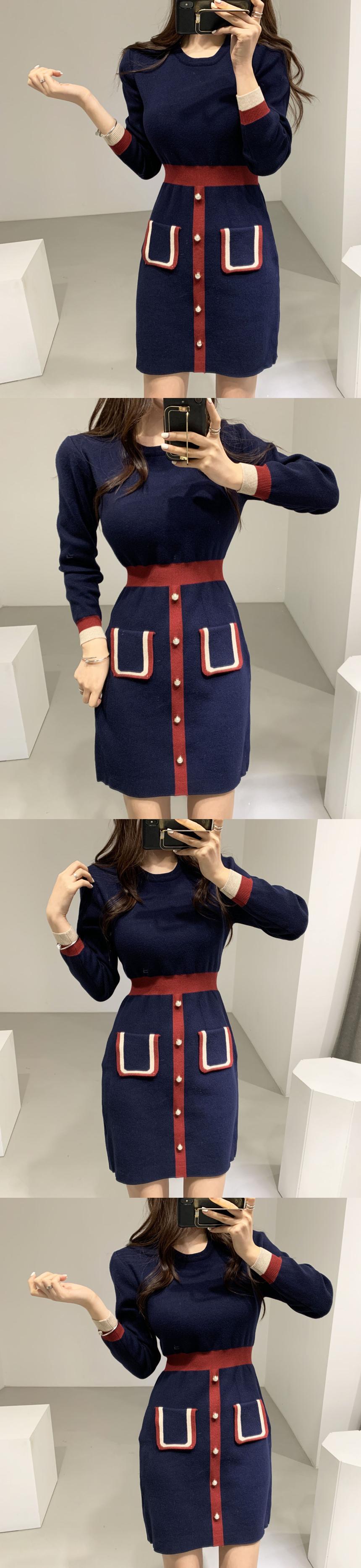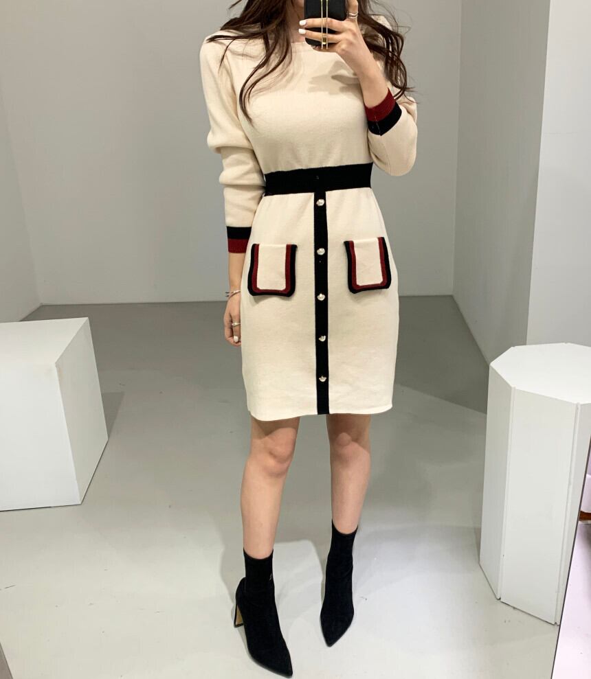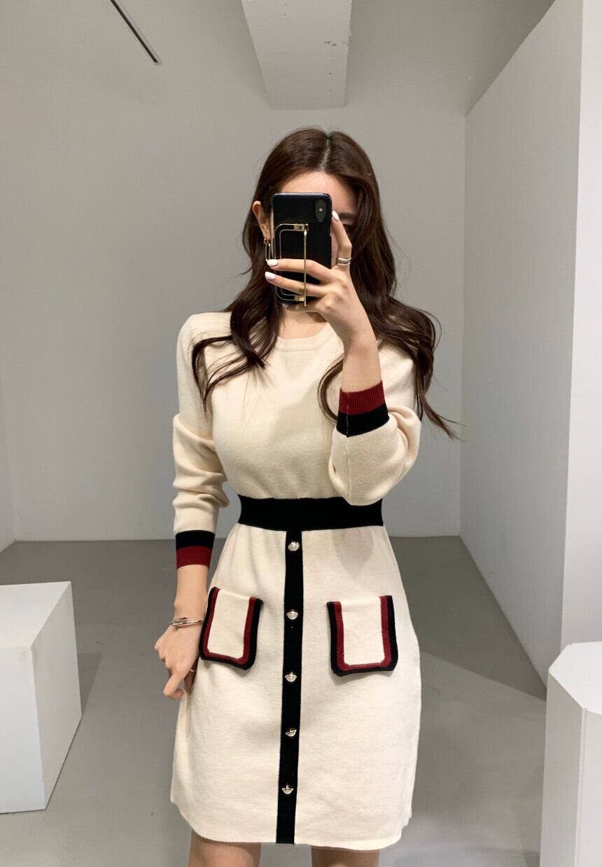 シックなレトロワイルドラウンドネックパッチフェイクポケットデコレーションスリムスリムハイウエストミッドセクションニットドレス 韓国婦人53532477597