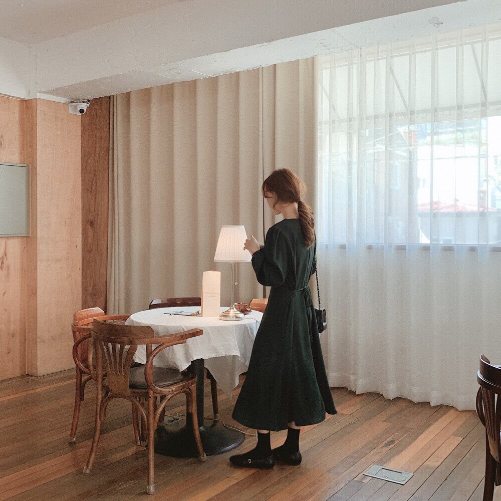 ラウンドネックウエストスカート女性2019秋の新しいファッション気質ダークグリーン長袖ミドル丈ドレス 韓国婦人75158762233