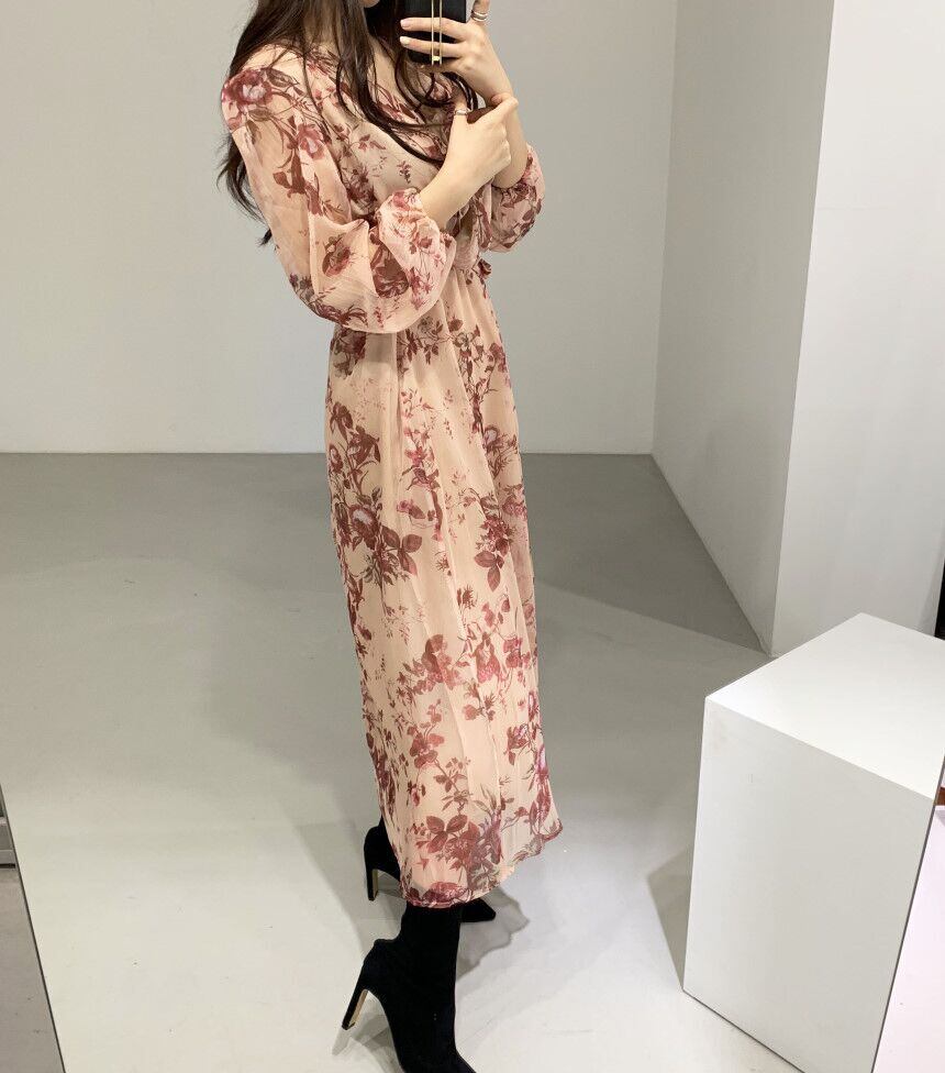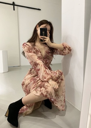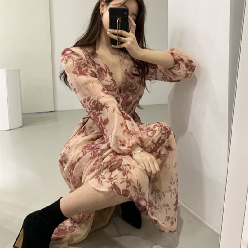 シックで優しくて甘いピンクの花Vネックフリルレースアップウエストと薄いロング膝丈ドレス 韓国婦人51999964091