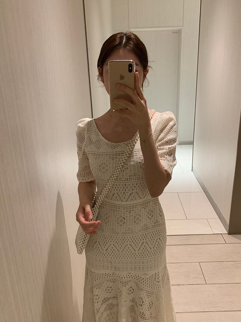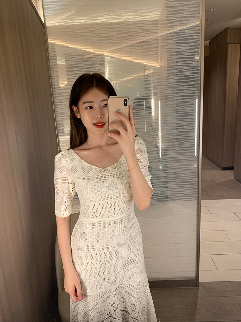 シックで甘く優しい細いVネックスリムレースかぎ針編み中空バッグヒップフィッシュテールドレスロングスカート女性 韓国婦人12771707510