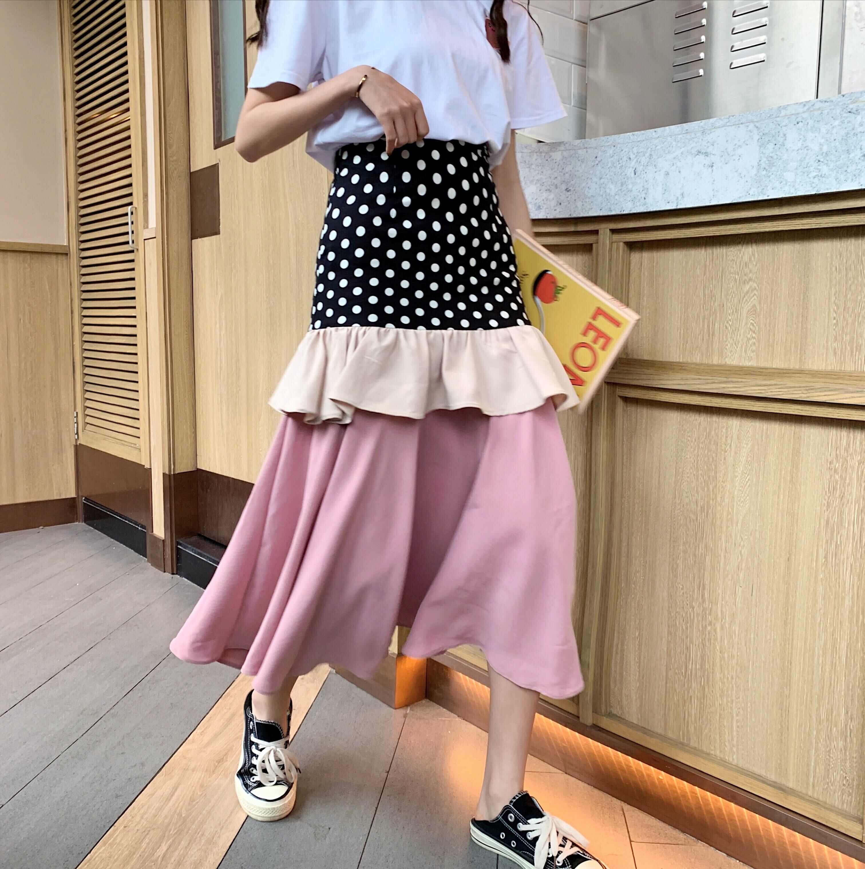 シック、ウエスタンスタイル、遊び心のある、黒と白のウェーブレットドットステッチ、コントラストカラー、ハイウエスト、薄いフリルスカート、ロングスカート、女性 韓国婦人45455496210