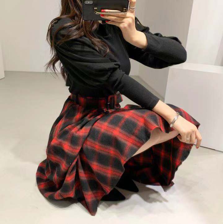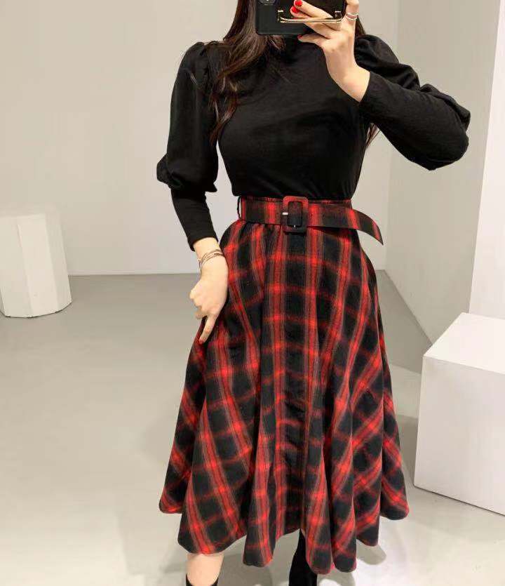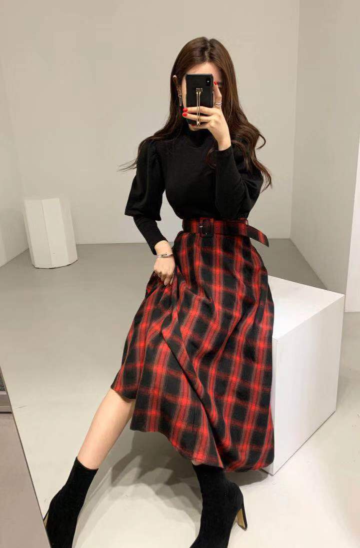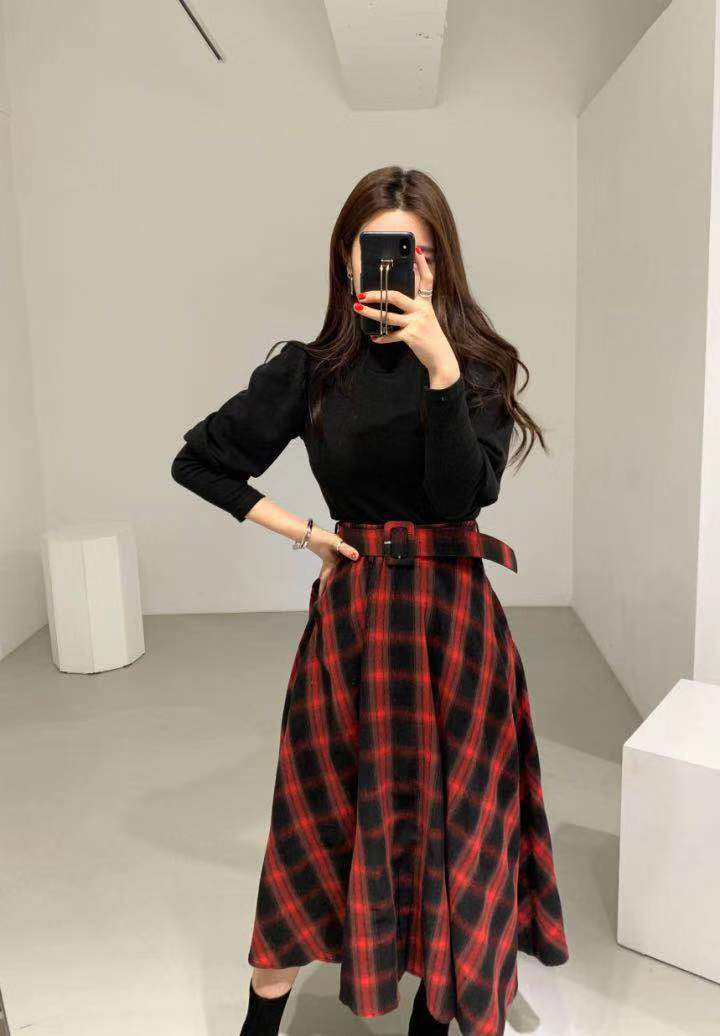 シックでエレガントなレトロなハーフハイネックスリムスリミングTシャツ+ハイウエストラージスイングチェック柄スカート 韓国婦人32400138219