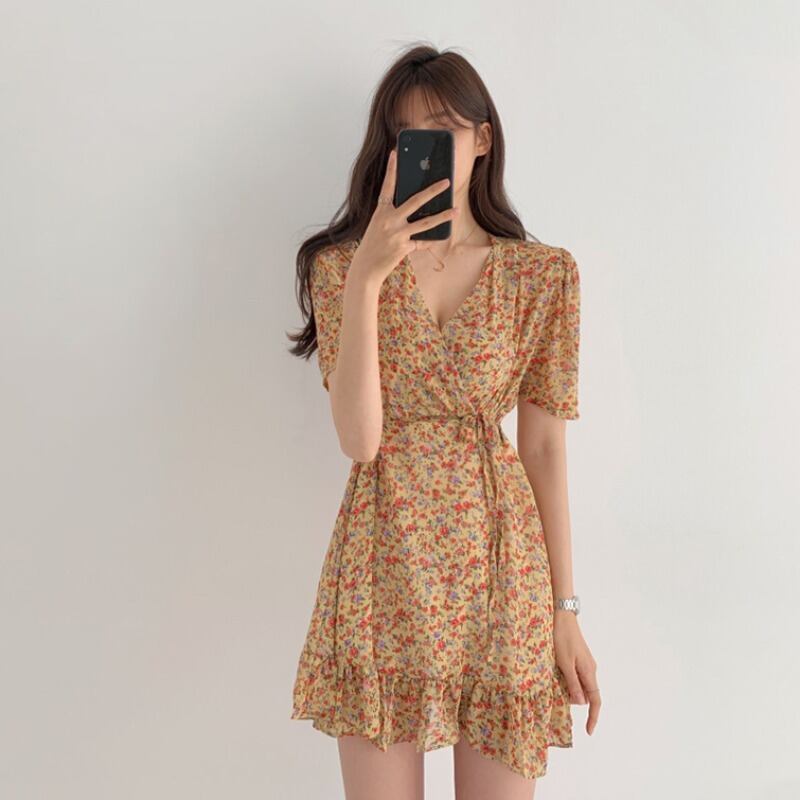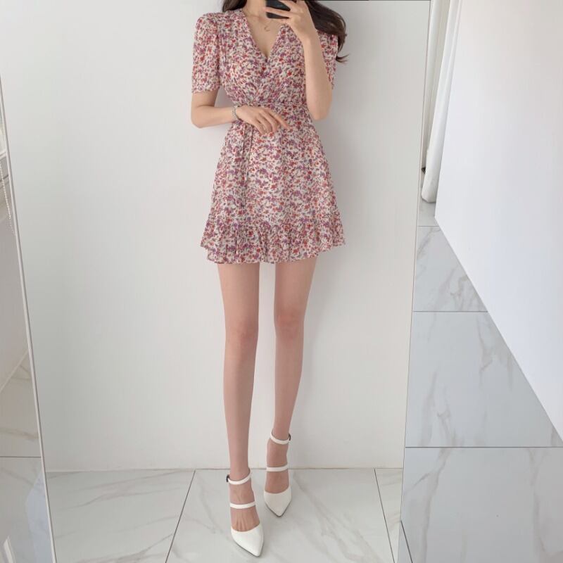 シックなスモールフレッシュで優しいフローラルホワイトVネックネクタイウエストスモールフリルシフォンワンピース 韓国婦人51783949462