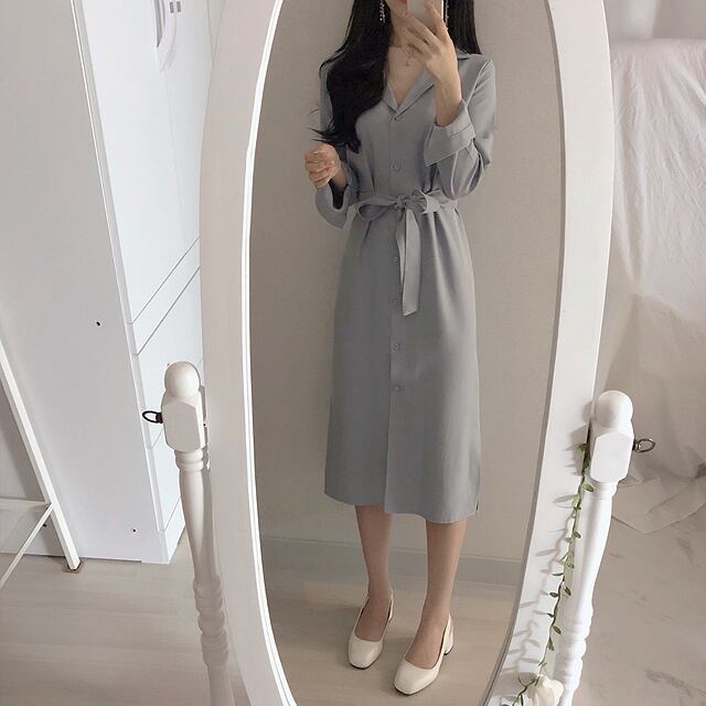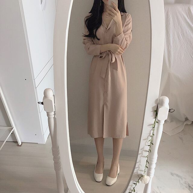 初秋新作2020ミドル丈長袖シャツワンピース女性デザインセンススモールウエスト気質ロングスカート 韓国婦人16968128484