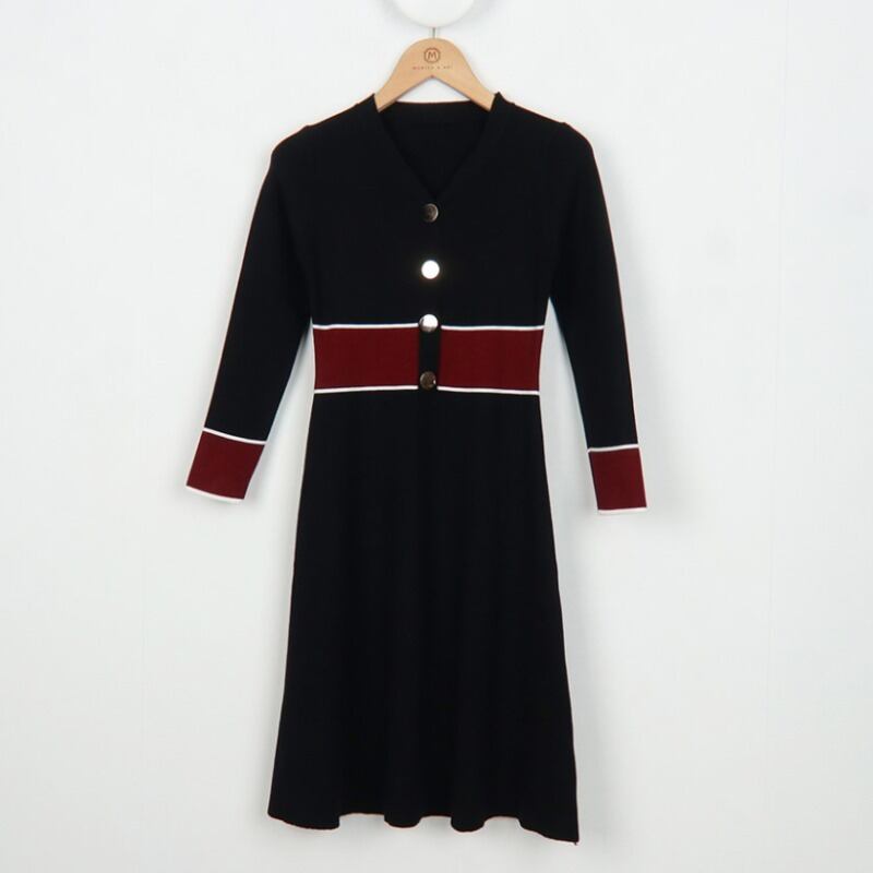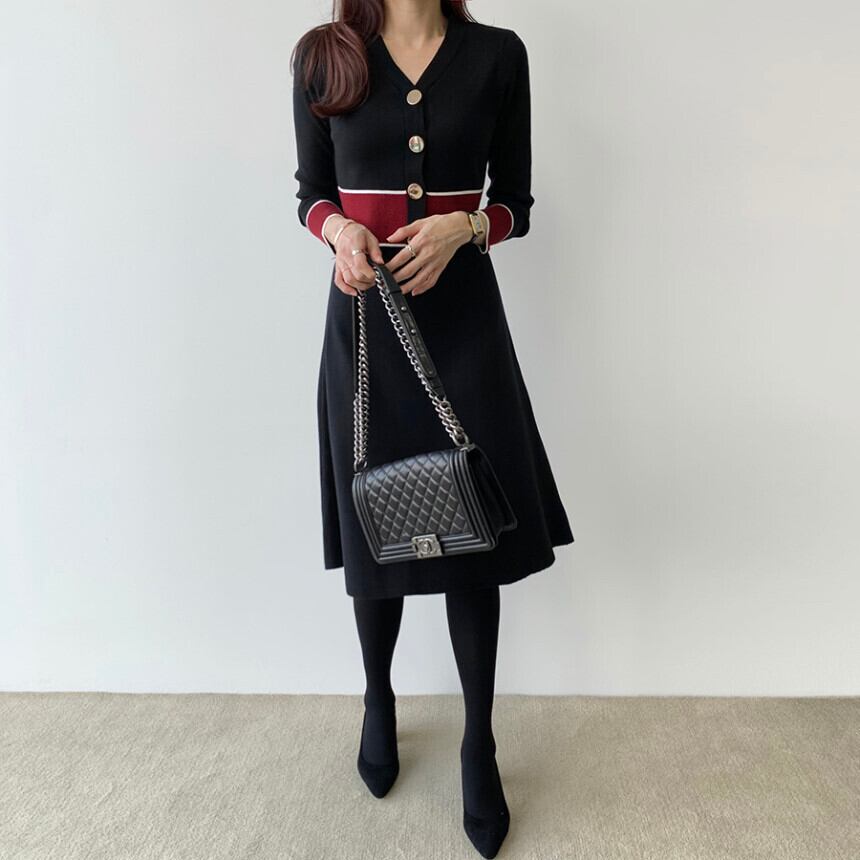 シックなニッチなエレガントなVネックのシックなボタンデザインのカラーマッチングは、より薄いミドル丈のAラインニットドレスです。 韓国婦人46353806322
