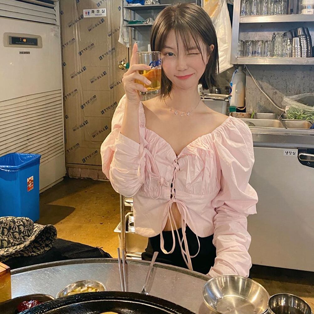 シックで優しいクリームパウダーが鎖骨プリーツ包帯を漏らしている白い四角い襟を明らかにキャプテン長袖シャツシャツ 韓国婦人4410623808