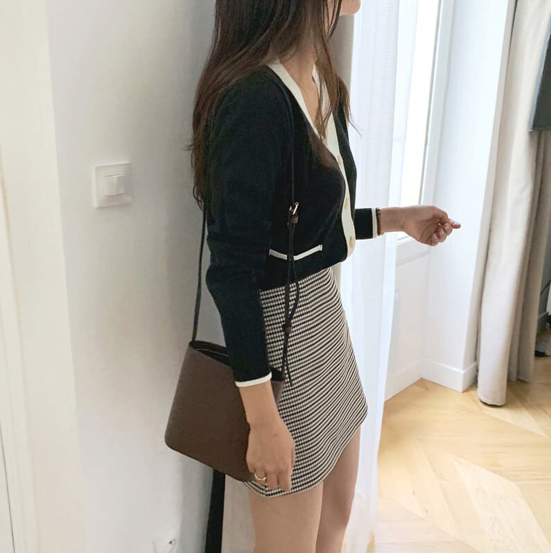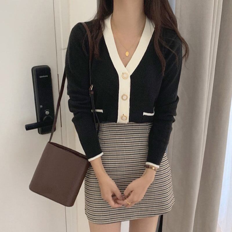 シックな秋冬の新しいレトロなスモールフレグランスワイルドVネックニットセータージャケット+ワイルドチェックスカート 韓国婦人18423888773