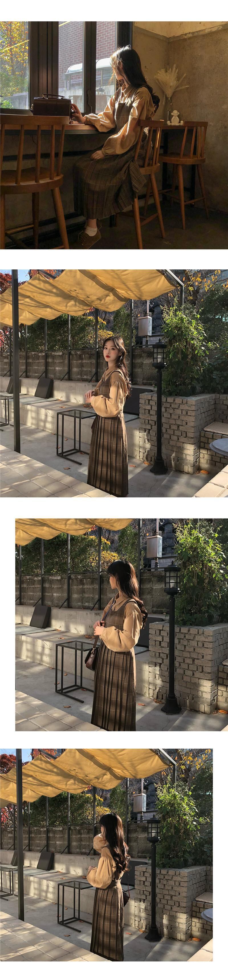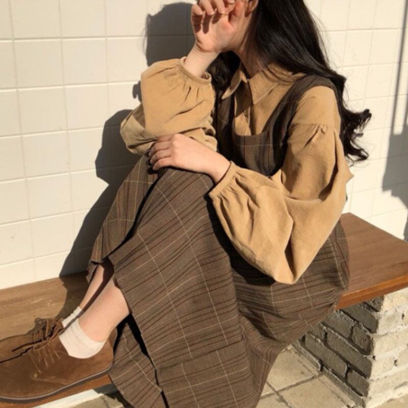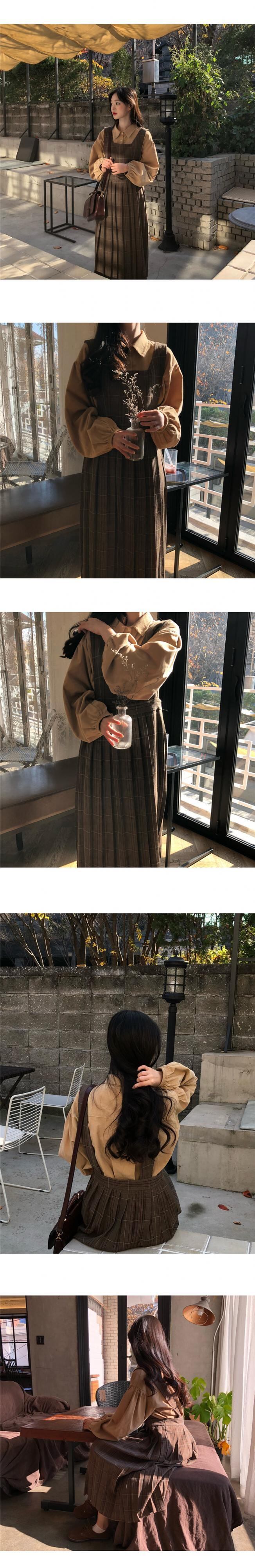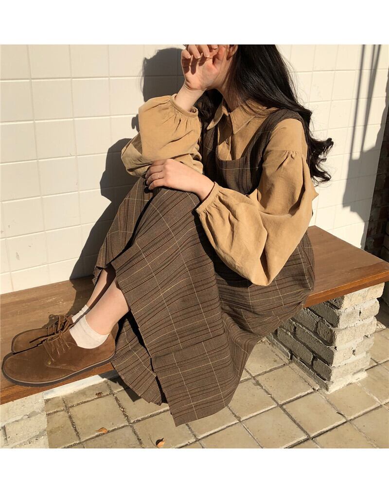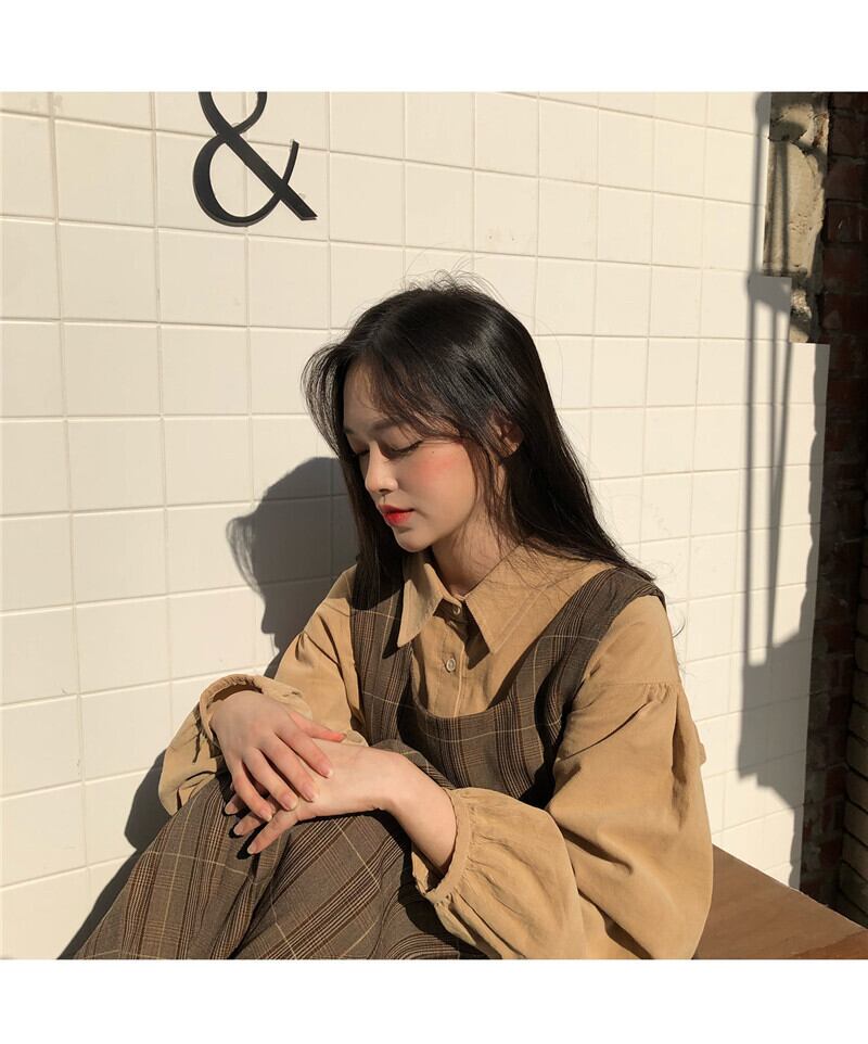 カジュアルスーツ女性春新作シックコーデュロイバブルスリーブシャツ+ベストドレスツーピーススーツ 韓国婦人18608220020