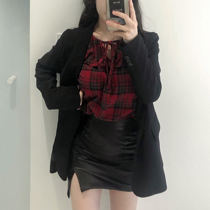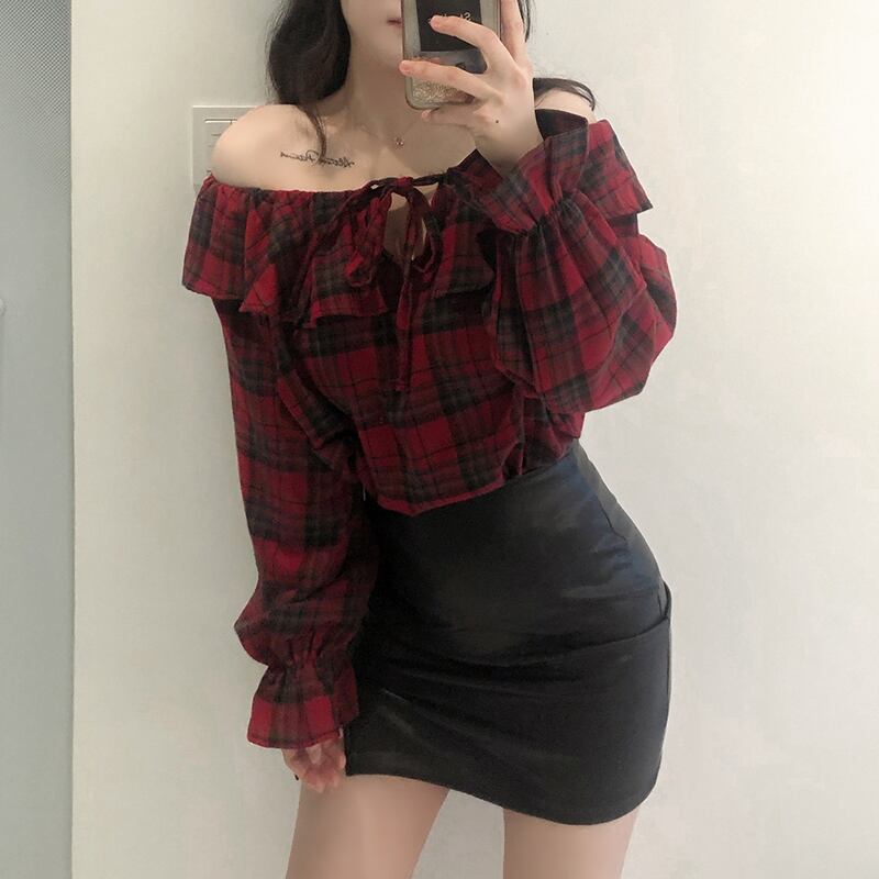 サウスシックスウィートレトロチェック柄ストラップレスレースアップカラーフリルルーズフレアスリーブシャツシャツレディース 韓国婦人62893036080