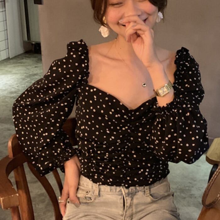 シックな春のシンプルなレトロな花柄のスクエアカラー露出鎖骨スリムスリミングフォールドショートアンビリカルシャツ女性 韓国婦人26661740430