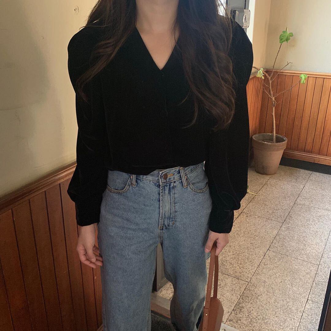 シックでシンプルなワイルドVネックシングルブレストルーズ無地パフスリーブベルベットボトミングシャツシャツ女性 韓国婦人49005033581