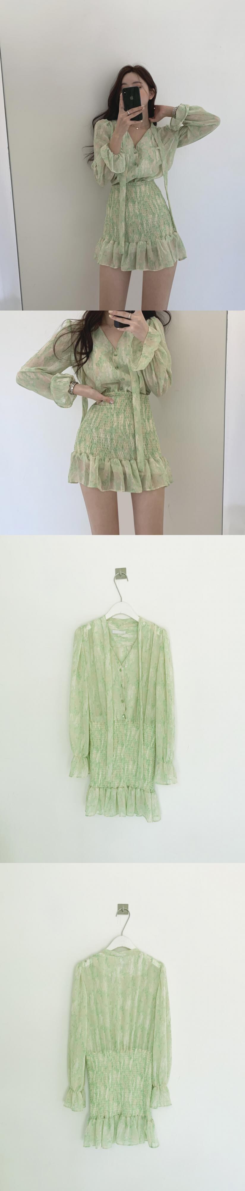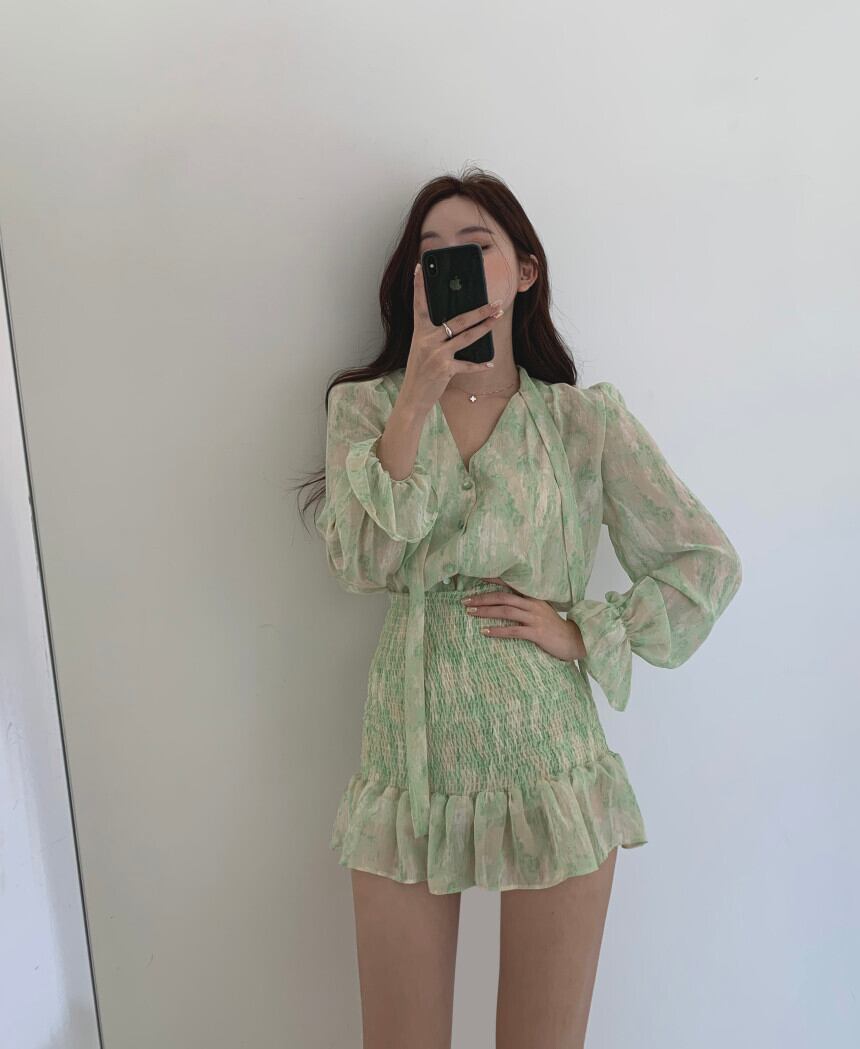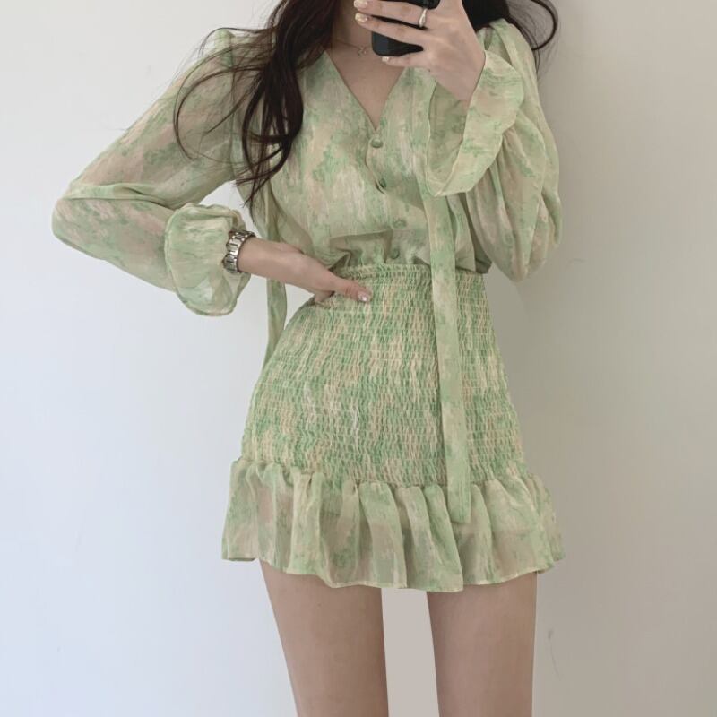 セクシーな気質シフォンフローラルバッグヒップドレスフリルVネックラップスカートプリーツウエストスリムスカート 韓国婦人90654034823