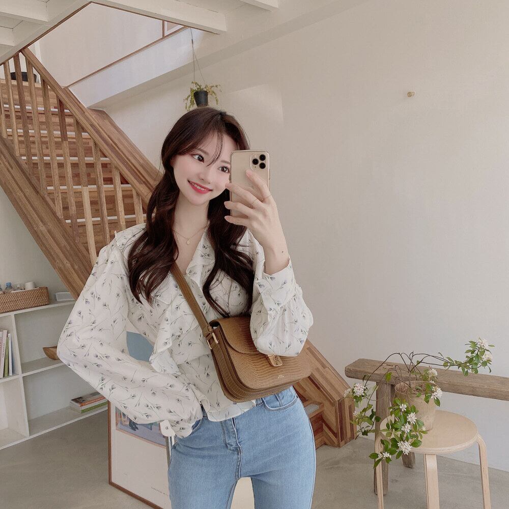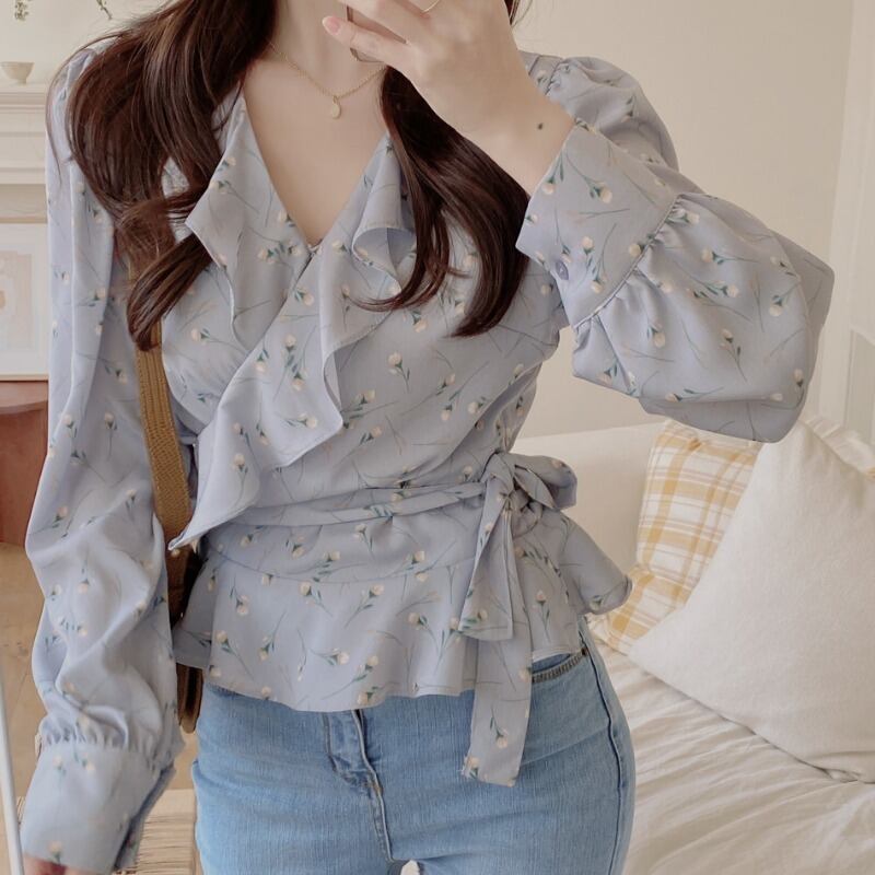 フリルワンピースフローラルシフォンシャツレディース2020春新作スタイルレースアップスリム長袖シャツ 韓国婦人51278697761