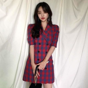 2020年春の新しいレトロなパフスリーブチェック柄半袖スーツドレス、ウエスト気質と薄いスカート 韓国婦人70343873535